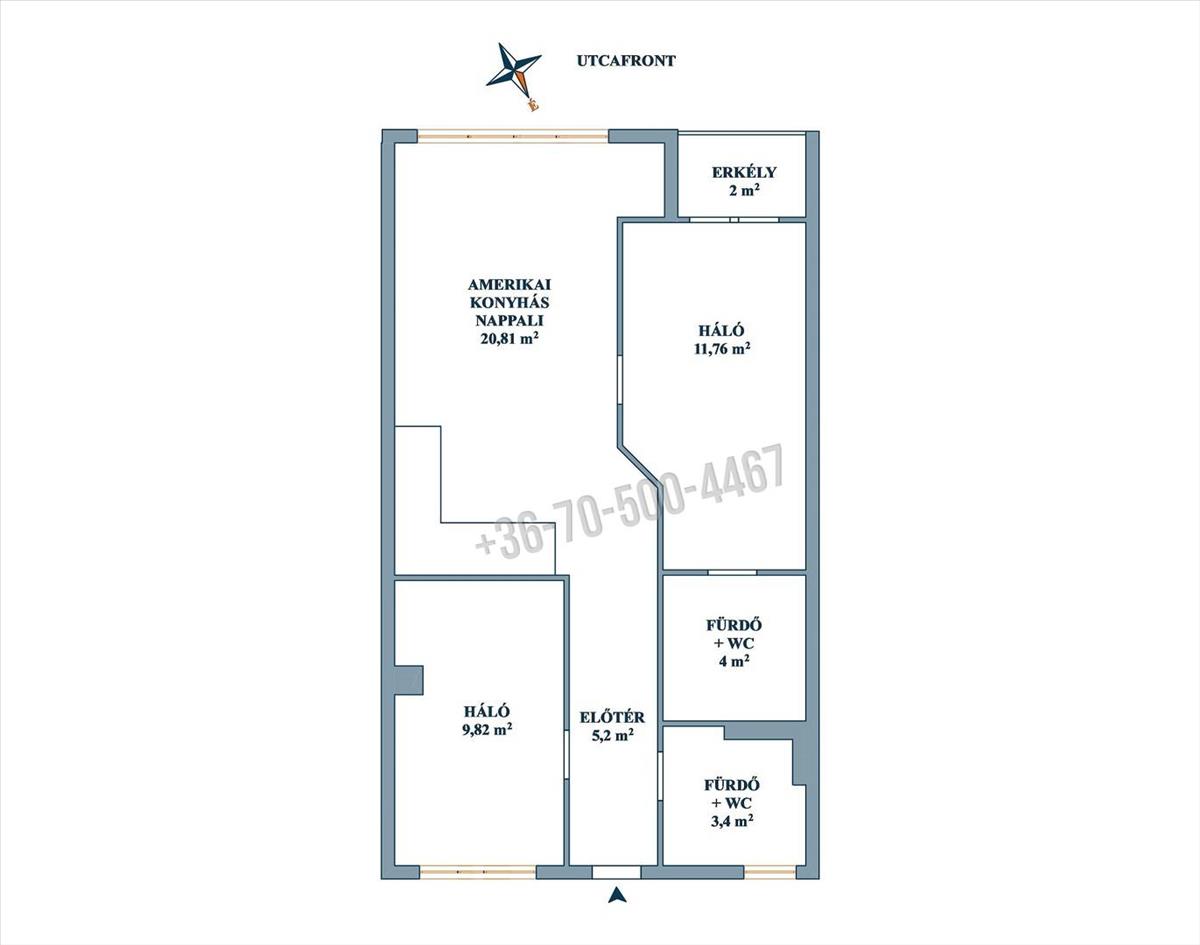 Alapterülete 57 nm + 2 nm erkély. Elrendezése tökéletes, ideális méretű amerikai konyhás nappali, 2 külön nyíló hálószoba, 2 külön álló fürdő toalettel, valamint egy előtér képezik részeit.