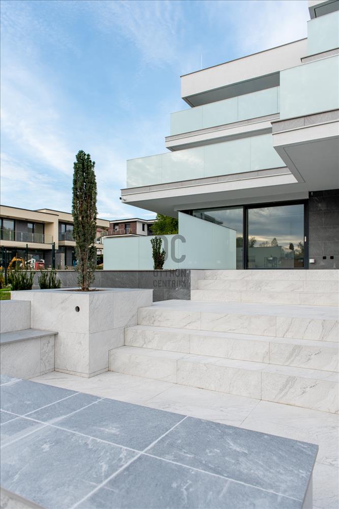 Épület külső homlokzatán, lépcsőházban és a teraszokon szintén nagyméretű Cesare Ceramica lapok vannak elhelyezve, a terasz burkolatba résfolyóka került elhelyezésre az üvegkorláton belül. Teraszok vízszigetelése Sika Fóliával, terv szerinti hőszigetelés vakum panellel és pir hőszigetelő táblákból lett kiépítve. Fűtöttek, áram és víz van, minden teraszra jakuzzi telepíthető, előkészítése megtörtént.
