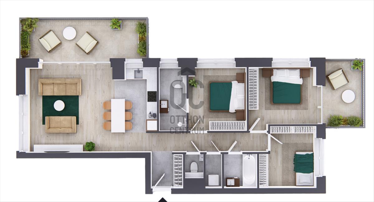 A lakáshoz két terasz tartozik: egyik a nappaliból, másik az egyik hálószobából nyílik, ideális elrendezést kínálva a közös és a privát terek elkülönítésére.