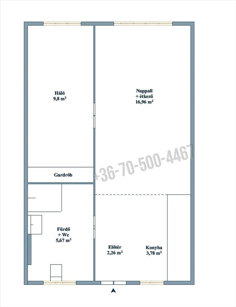 Jelenlegi kialakítása egy tágas nappali, melyhez az előtér és konyha kapcsolódik, egy külön álló, tágas hálószoba méretes gardróbbal, valamint egy zuhannyal felszerelt fürdő toalettel képezik részeit.