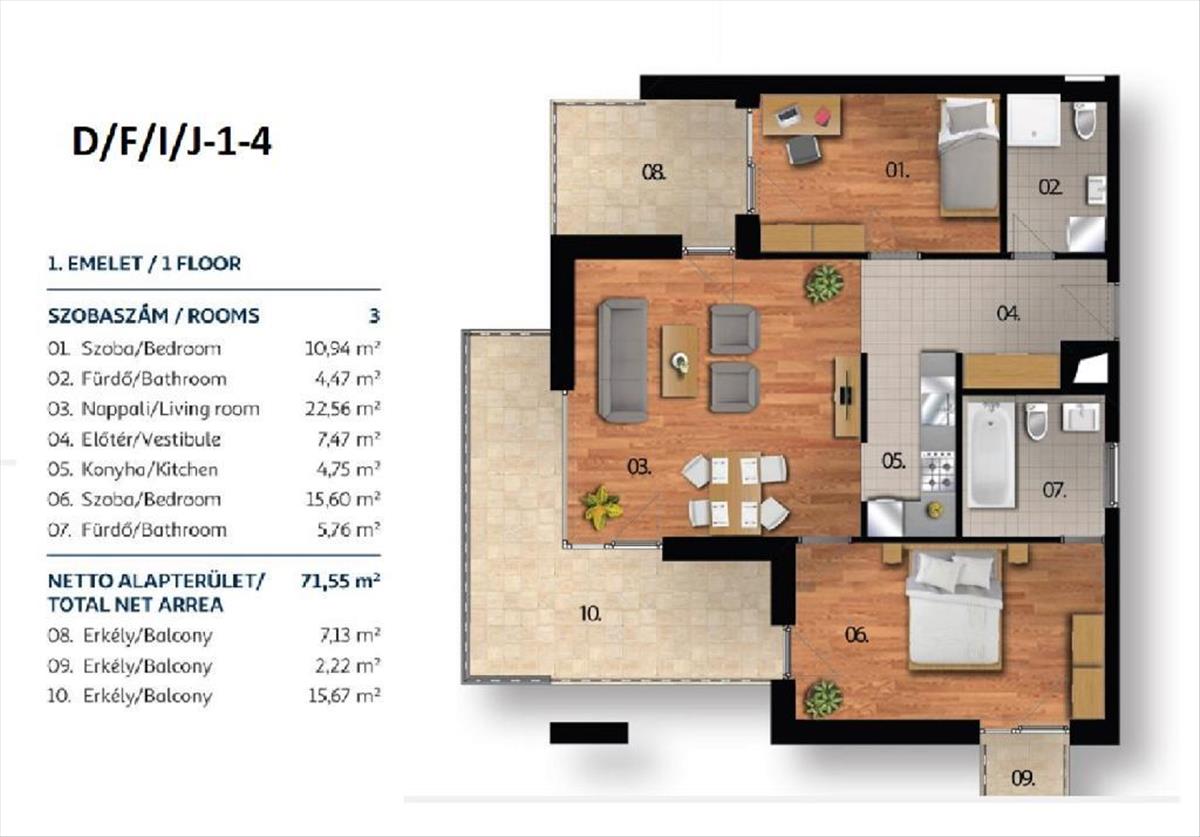 Lakások mérete: 43 nm-es, 1, 5 szobás lakástól a 150 nm-es, 5 szobás és a tetőteraszos, exkluzív penthouseig.