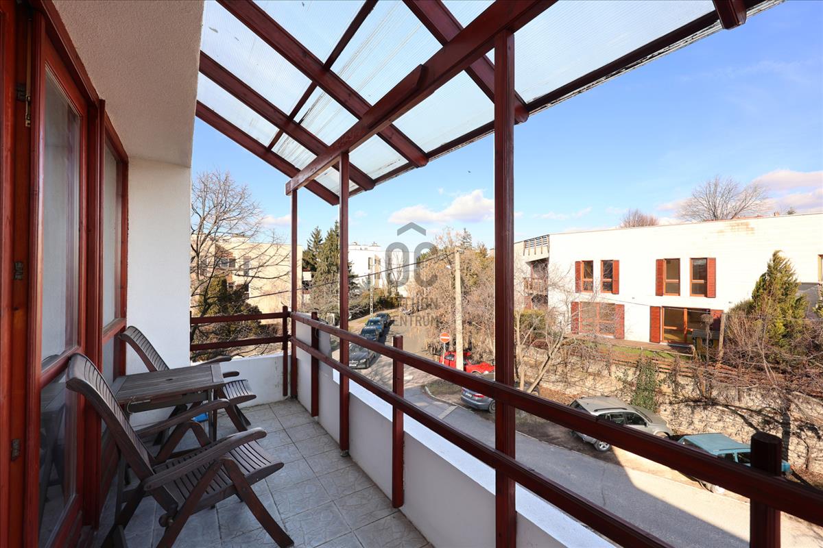 Az erkély részben panorámás kilátást nyújt, részben egy csendes, zöld zsákutcára tekint — ideális helyszín reggeli kávéhoz vagy egy hosszú nap utáni nyugodt esti pillanatokhoz.