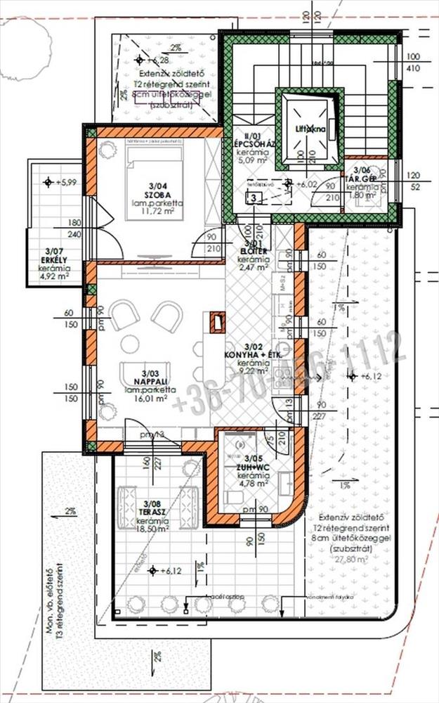 •55 m² hasznos alapterület, nappali + 1 hálószoba