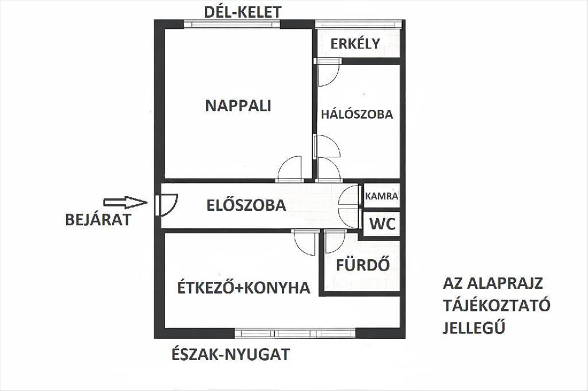 A világos konyha tágas étkezővel kapcsolódik; a fürdőszoba és a wc külön helyiségben találhatók.