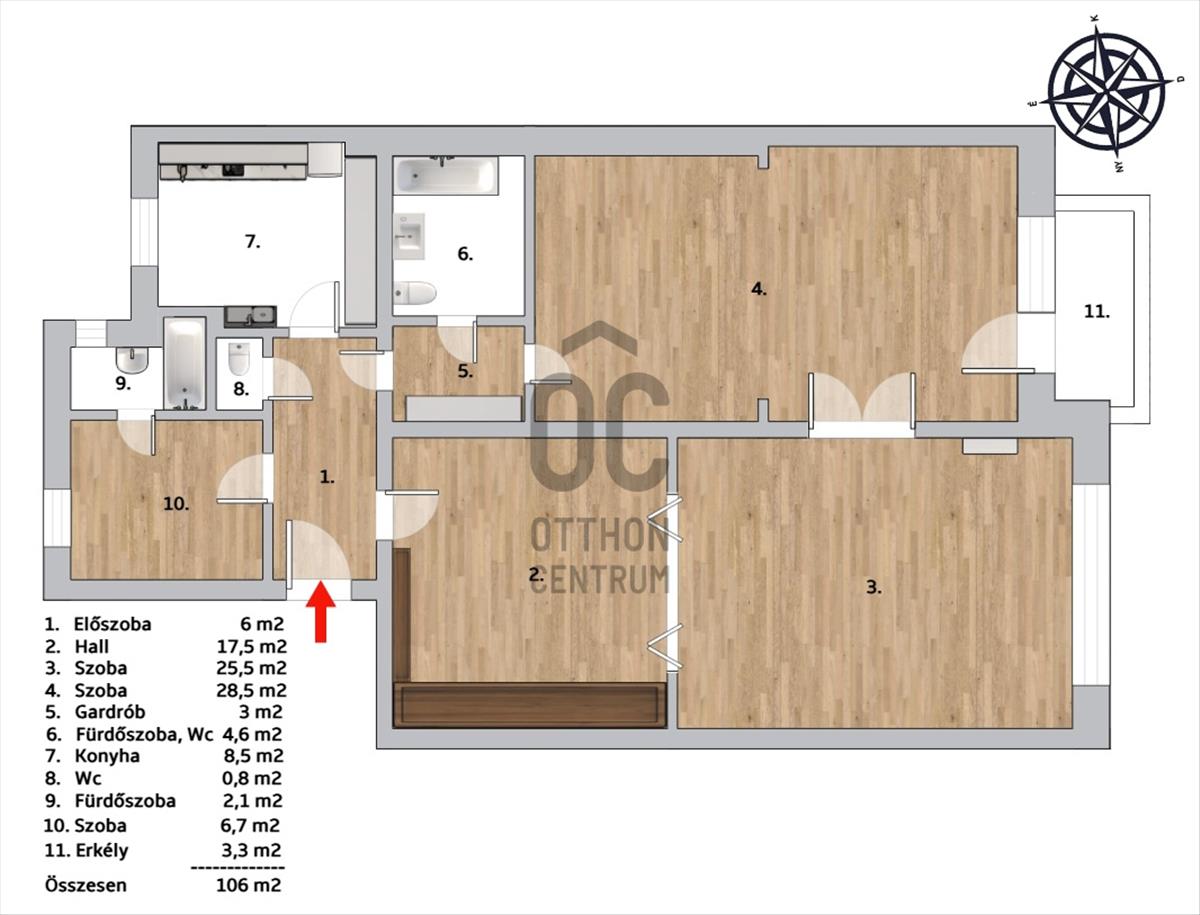 - Felosztása: előszoba, hall, konyha, nappali, 2 hálószoba, 2 fürdőszoba az egyik WC-vel rendelkezik, közlekedő - ami gardrób is, és egy külön WC.