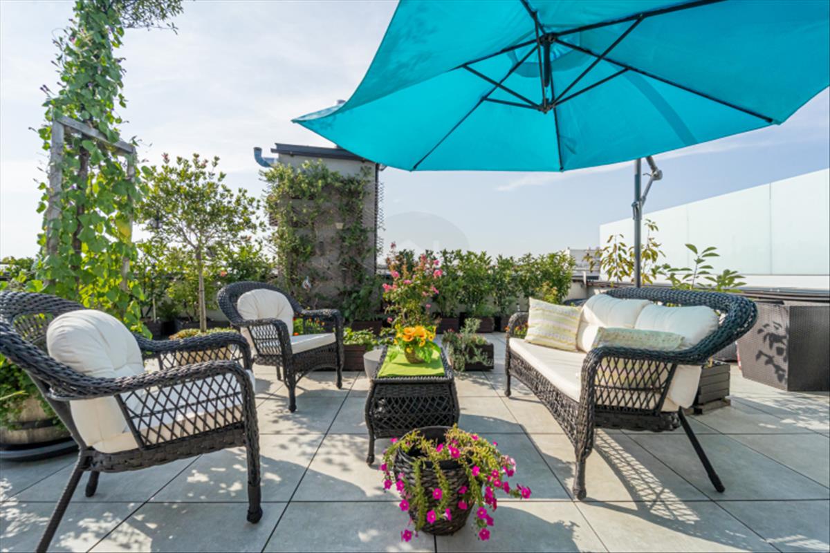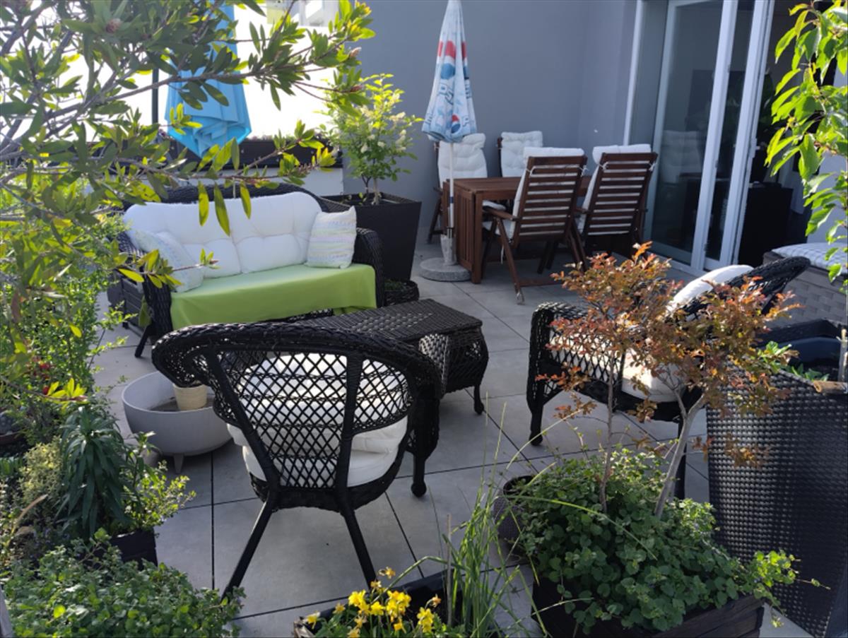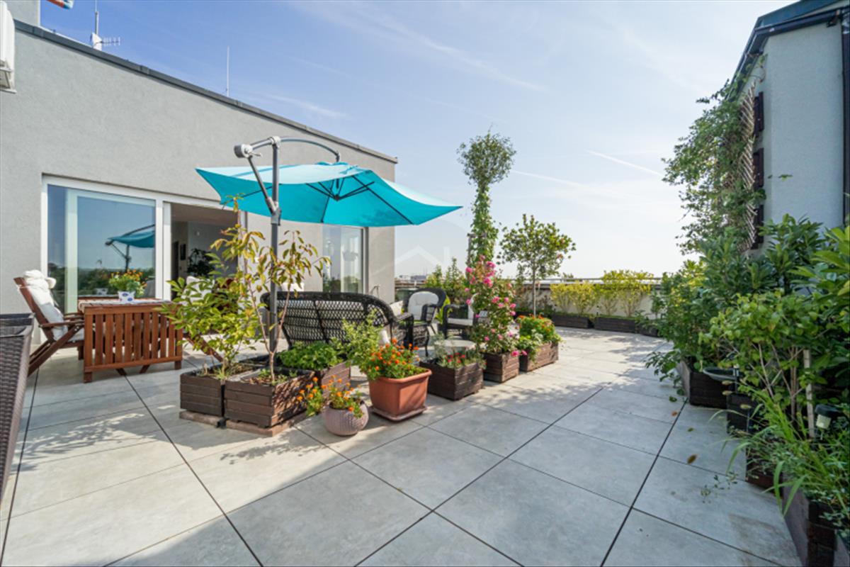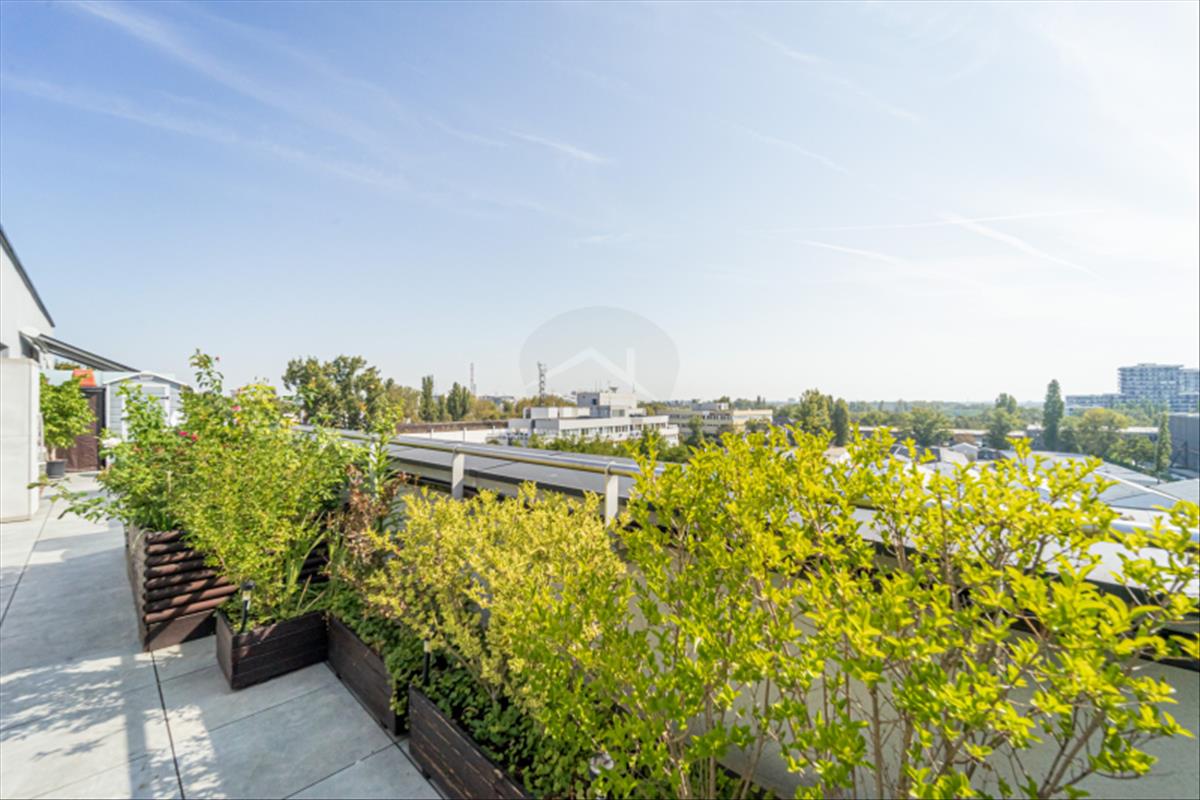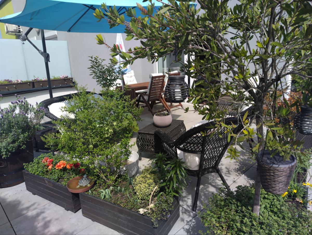 A lakáshoz tartozó, 90 m²-es, mediterrán stílusú tetőkert teljesen kiépített és botanikusi szemmel is irigylésre méltó növényzettel rendelkezik. a déli fekvésnek és a professzionálisan megtervezett öntözőrendszernek köszönhetően a fenntartása minimális időráfordítást igényel, mégis egész évben kellemes, természetközeli életteret biztosít.