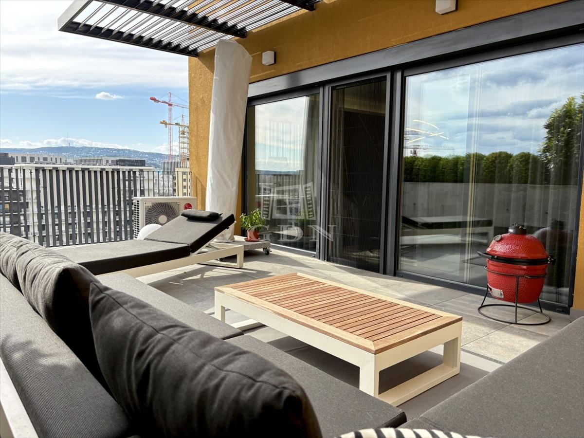 A lakáshoz dél–nyugati tájolású, privát napozóterasz tartozik, felsőkategóriás kerti bútorokkal, napernyővel, és lenyűgöző panorámával a budai hegyek felé. a terasz teljes intimitást biztosít, a növényeket automata öntözőrendszer látja el.