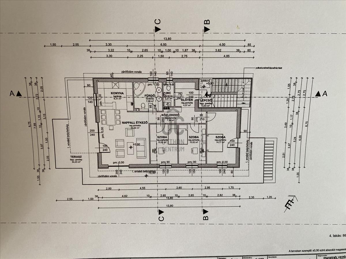 90 m² lakótér + 64, 4 m² terasz.