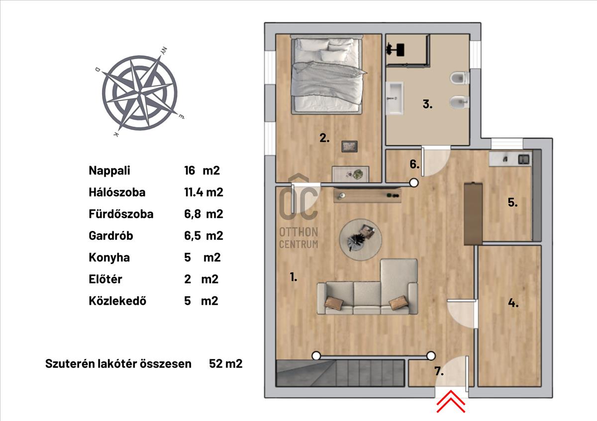 - Szuterén: nappali-konyha, hálószoba, gardrób, fürdőszoba, előtér beépített szekrénnyel.