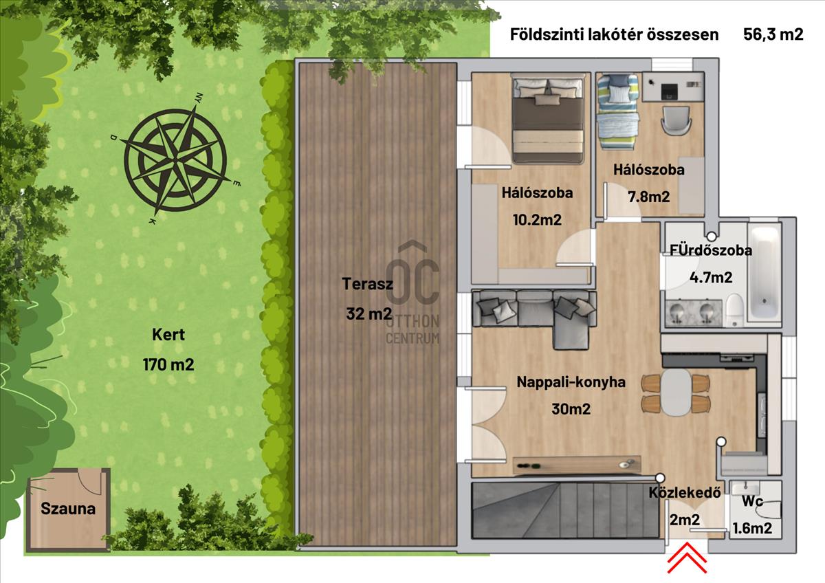 - Az ingatlanhoz tartozik egy 32 m2-es terasz, amely kapcsolódik a 170m2-es kerthez.