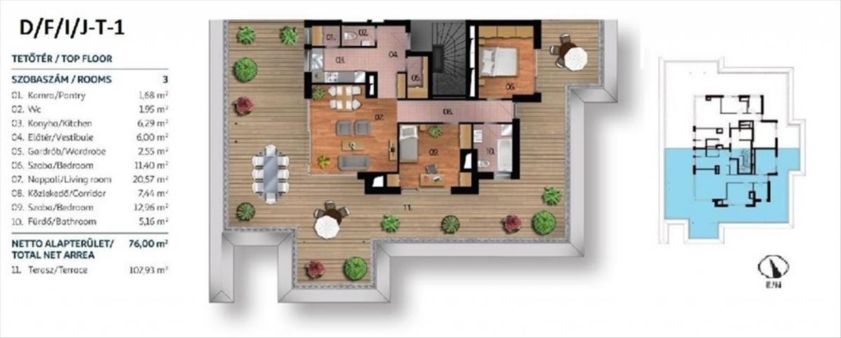 Lakások mérete: 43 nm-es, 1, 5 szobás lakástól a 150 nm-es, 5 szobás és a tetőteraszos, exkluzív penthouseig.
