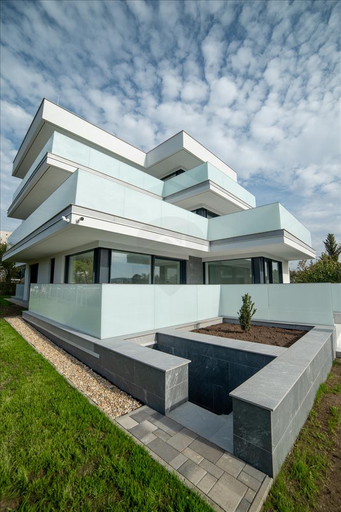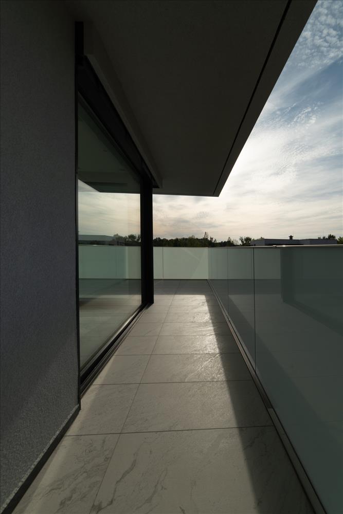 A ház természetes klímáját a 44cm vastag, hőszigeteléssel ellátott külső térelhatároló falszerkezetek, valamint a nappali és a szobák nagy üvegfelületei előtt végig futó vízszintes előtetők-árnyékolók, az internorm - studio KF500-as üvegfalak-ajtók-ablakok - Hőszigetelés (W/m²K-ig) Uw 0, 61 - és az üveg szerkezetek előtt futó árnyékolók, zsaluziák biztosítják.