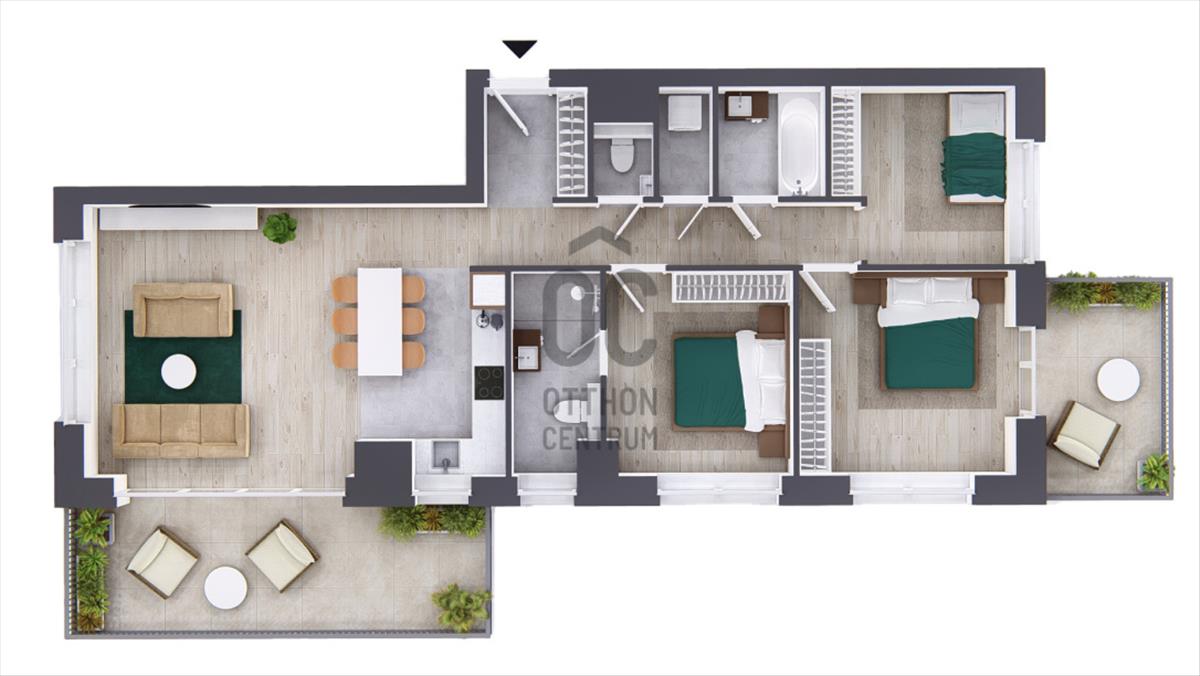 A lakáshoz két terasz tartozik: egyik a nappaliból, másik az egyik hálószobából nyílik, ideális elrendezést kínálva a közös és a privát terek elkülönítésére.