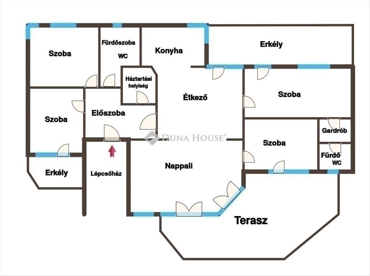 A szóban forgó ingatlan a földszinten helyezkedik el, így három teraszból kettő közvetlen kertkapcsolatos. Elosztása kiváló, négy hálószoba, tágas nappali, konyha, két fürdőszoba mellékhelyiséggel, háztartási helyiség / mosókonyha. Extra, hogy a szülői hálószobához tartozik egy saját gardrób és fürdőszoba. a melegről a társasház kazánja gondoskodik, radiátoros hőleadókkal. a lakás állapota műszakilag megfelelő, de esztétikai felújítást igényel.