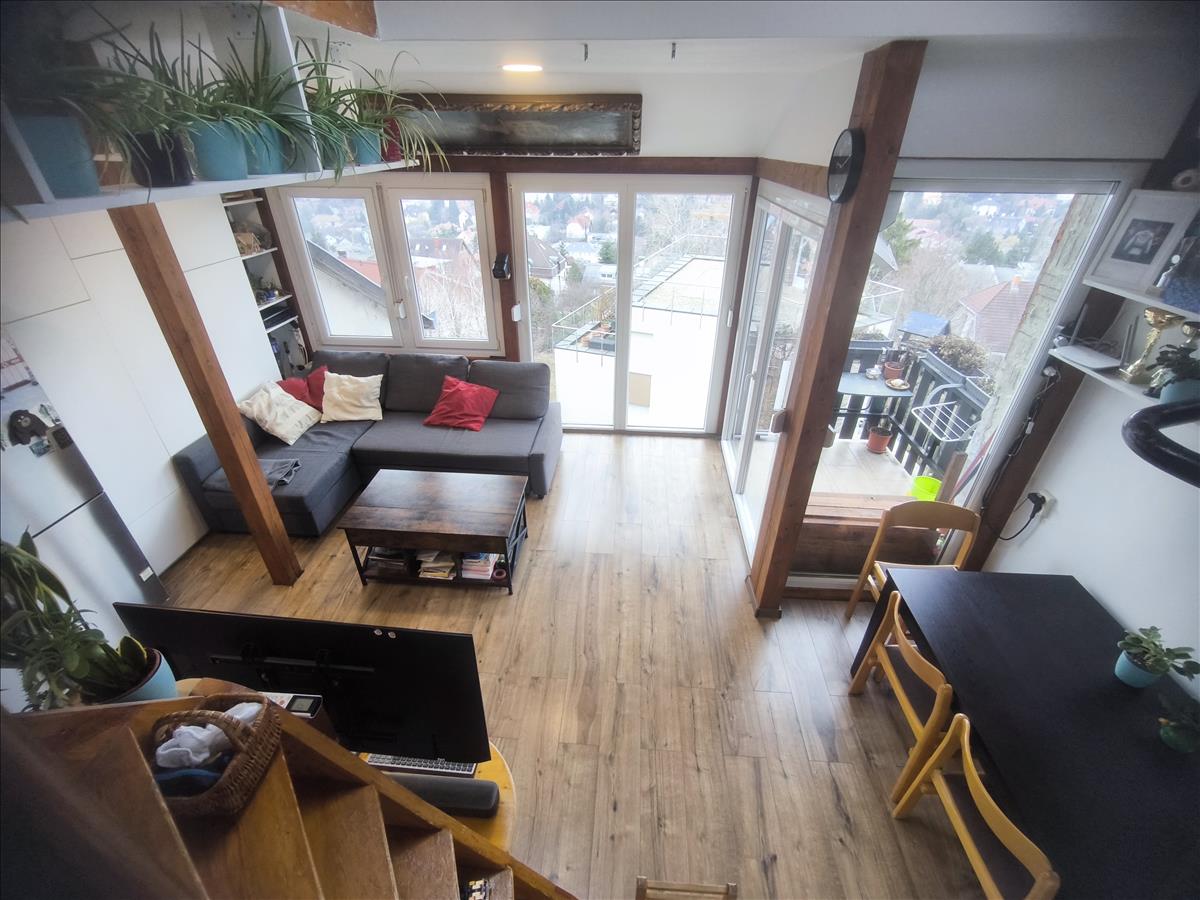 Sasadon eladó panorámás, kétszintes, 86 m2-es hasznos alapterületű lakás, két terasszal, hozzá tartozó 25 m2 es garázzsal, ami jelenleg 20 m2 es garzonként és 5 m2 es tárolóként funkcionál.