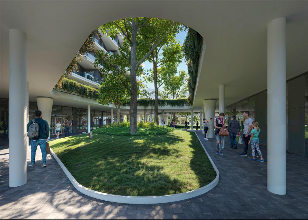A zöldtetők, parkosított udvarok és természetes anyaghasználat az épített környezet és a természet összhangját teremti meg.