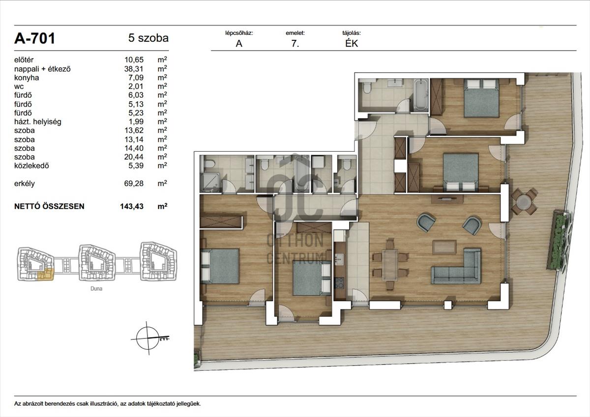 A teraszról a Duna látványa, a vízpart halk morajlása és a modern városi környezet tökéletes harmóniája adja az itt élők mindennapjainak különleges atmoszféráját.