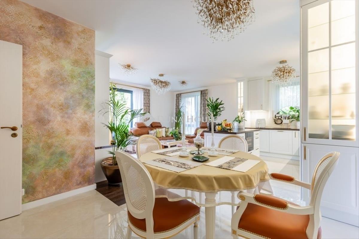 Étkező - neobarokk pompábanA XVI. Lajos korát idéző neobarokk étkezőgarnitúra a milánói kézműves mesterek keze munkáját dicséri. Az egyedi falfestés exkluzív műalkotásként emeli a tér atmoszféráját, miközben a luxusérzet minden pillanatban áthatja az étkezések élményét. a konyha - high-tech felszereltségű és minden igényt kielégítő! Az egyedi tervezésű konyhabútor masszív kőpulttal, beépített prémium készülékekkel (Gaggenau, Bosch, Liebherr) és szigeten elhelyezett borhűtővel rendelkezik. a funkcionalitás és az esztétikum tökéletes harmóniáját a Villeroy&Boch mosogató, valamint az arannyal futtatott DornBracht csaptelep teszi teljessé. Nappali - rejtett luxusmegoldásokA konyha stílusához illeszkedő, mégis egyedi gyártású vitrinkombináció elegáns módon rejti el a TV-t, hogy a tér minden egyes eleme a kifinomult design szolgálatába álljon. a zuhanyzós fürdőszoba - privát spa-élmény. a második fürdőszoba sem marad el az exkluzivitásban: Villeroy&Boch szaniterek, 13 karátos aranyozott DornBracht csaptelepek, valamint egy épített wellness-zuhanykabin. a háromállású zuhanyrendszer (fejzuhany, kézizuhany, nyak-zuhatag) és a Hüppe aranyozott üvegkabin minden használatkor a luxus és a kényeztetés érzését nyújtja.