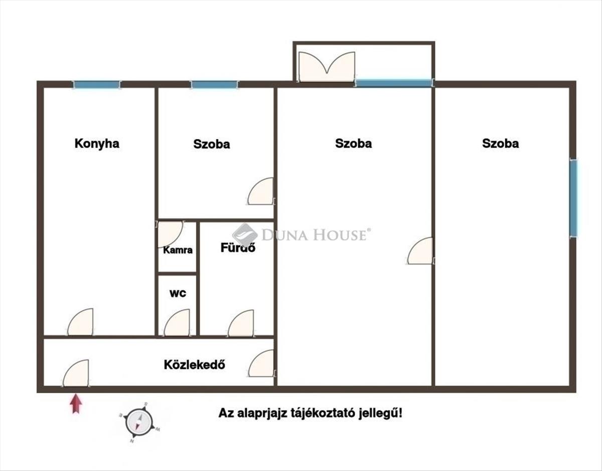 Elrendezés: kiváló alaprajz, három különnyíló szoba