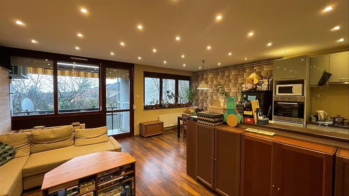 A lakás központi része a tágas, nagy üvegfelülettel rendelkező, dk-i fekvésű, erkélykapcsolatos, szép kilátással rendelkező amerikai konyhás nappali.