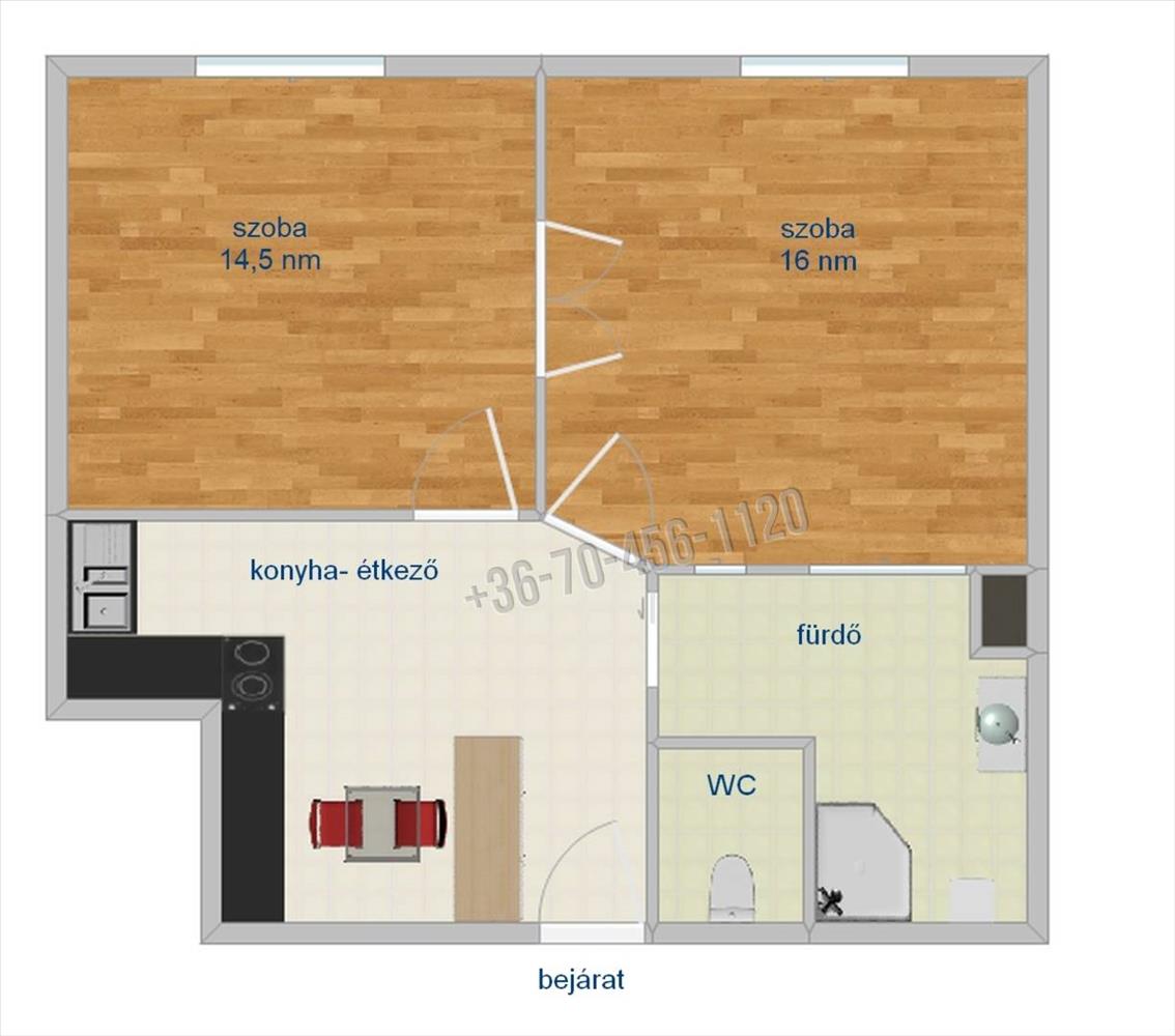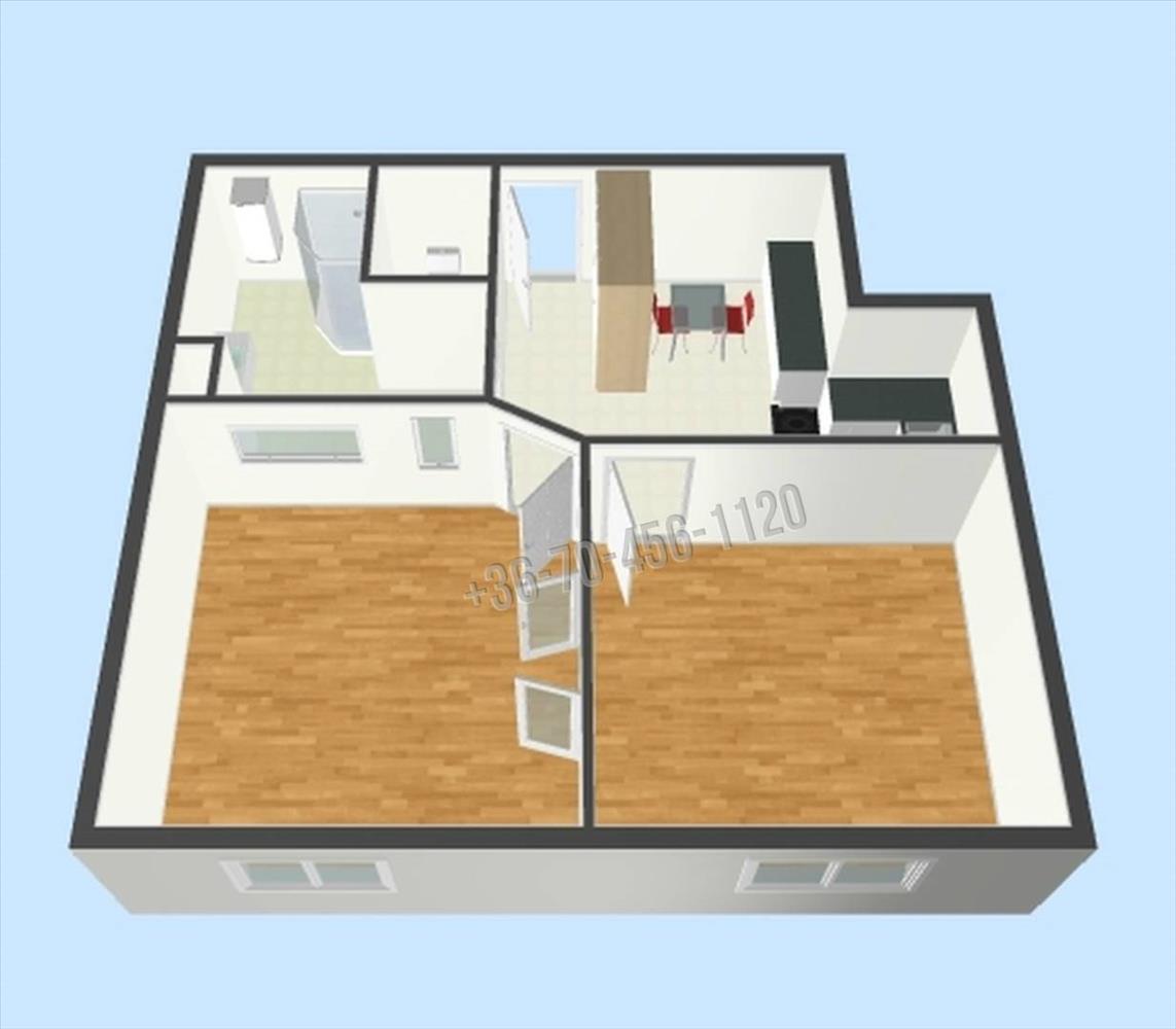 •2 külön nyíló szoba, étkezős konyha, zuhanyzós fürdő, WC