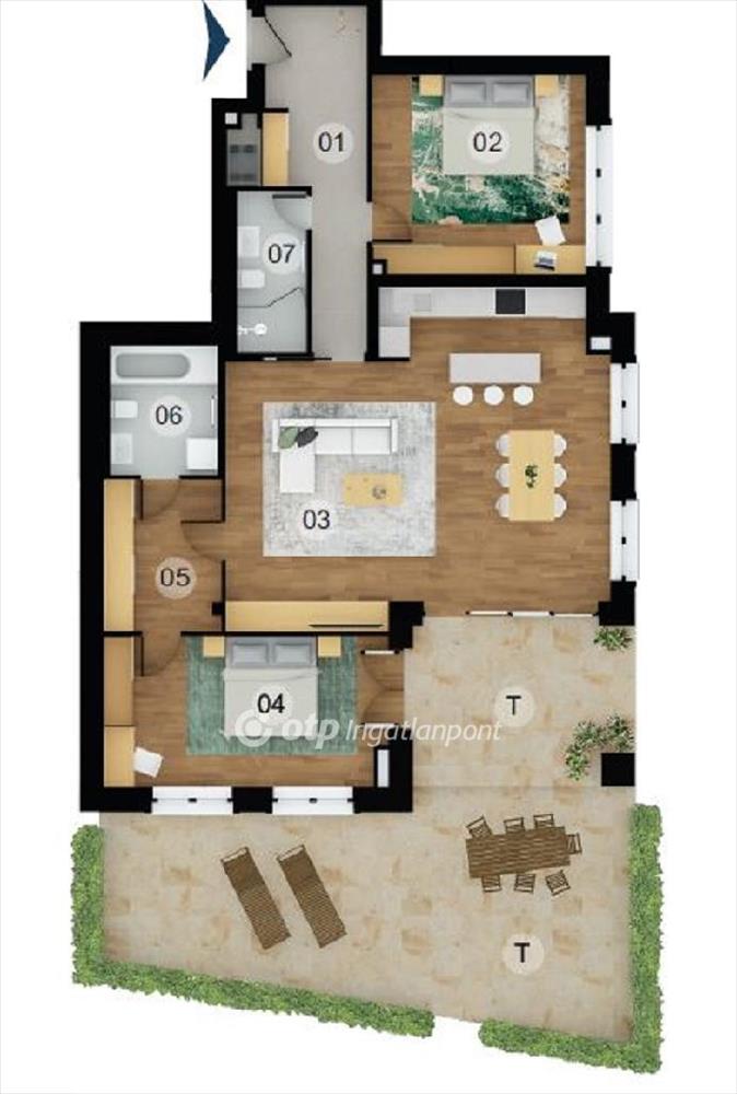 A hirdetésben szereplő lakás, az a épület földszintjén helyezkedik el, ény tájolással, 106. 78 m2 alapterülettel, mely életteret tovább növeli a 55. 91 m2 alapterületű terasz és a 62. 68 m2 területű privát kert. a lakás helyiségei: Előszoba, Fürdőszoba, Fürdőszoba, Közlekedő-Gardrób, Szoba, Amerikai konyhás nappali, Félszoba, Szoba.