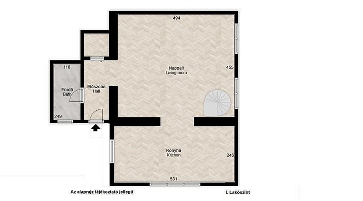 A bejárati szinten található, egy 22 nm -es tágas nappali, mely szomszédságában találjuk, az ideális méretű, ablakos étkezős konyhát. Ugyanezen szinten került kialakításra egy kádas fürdőszoba wc-vel, illetve egy gardrób.