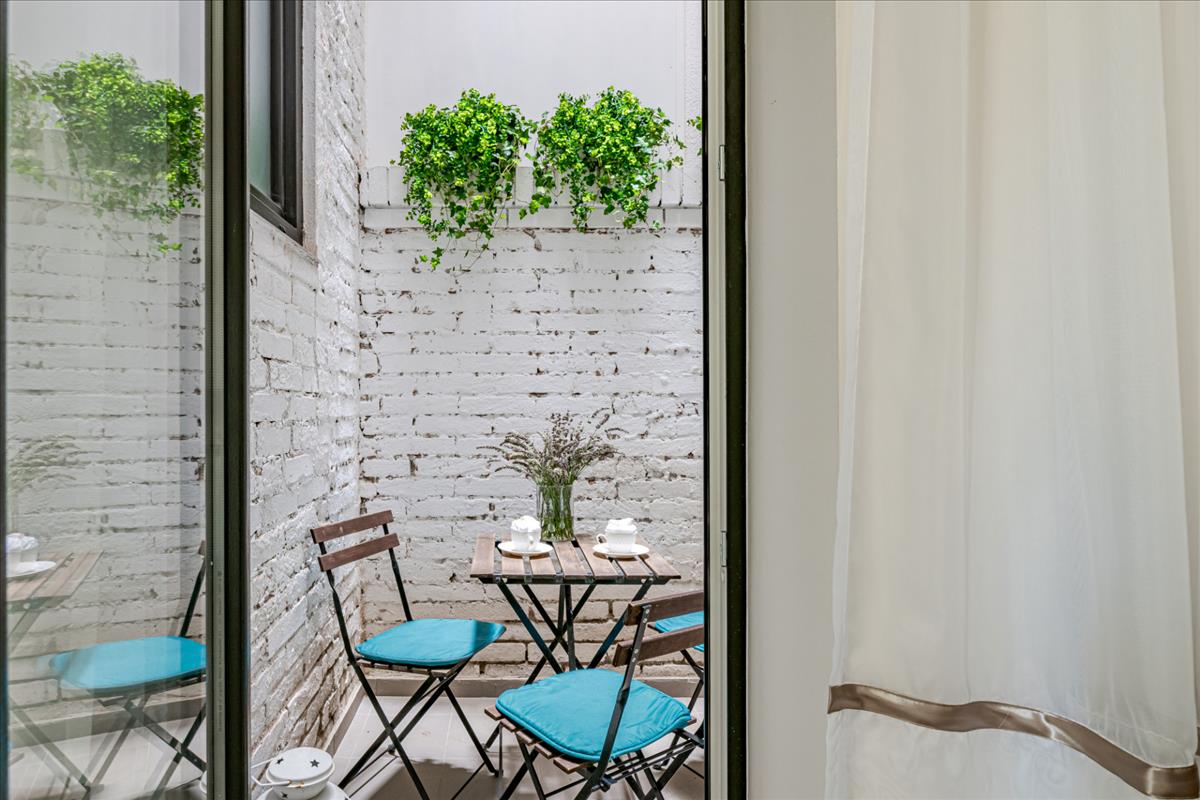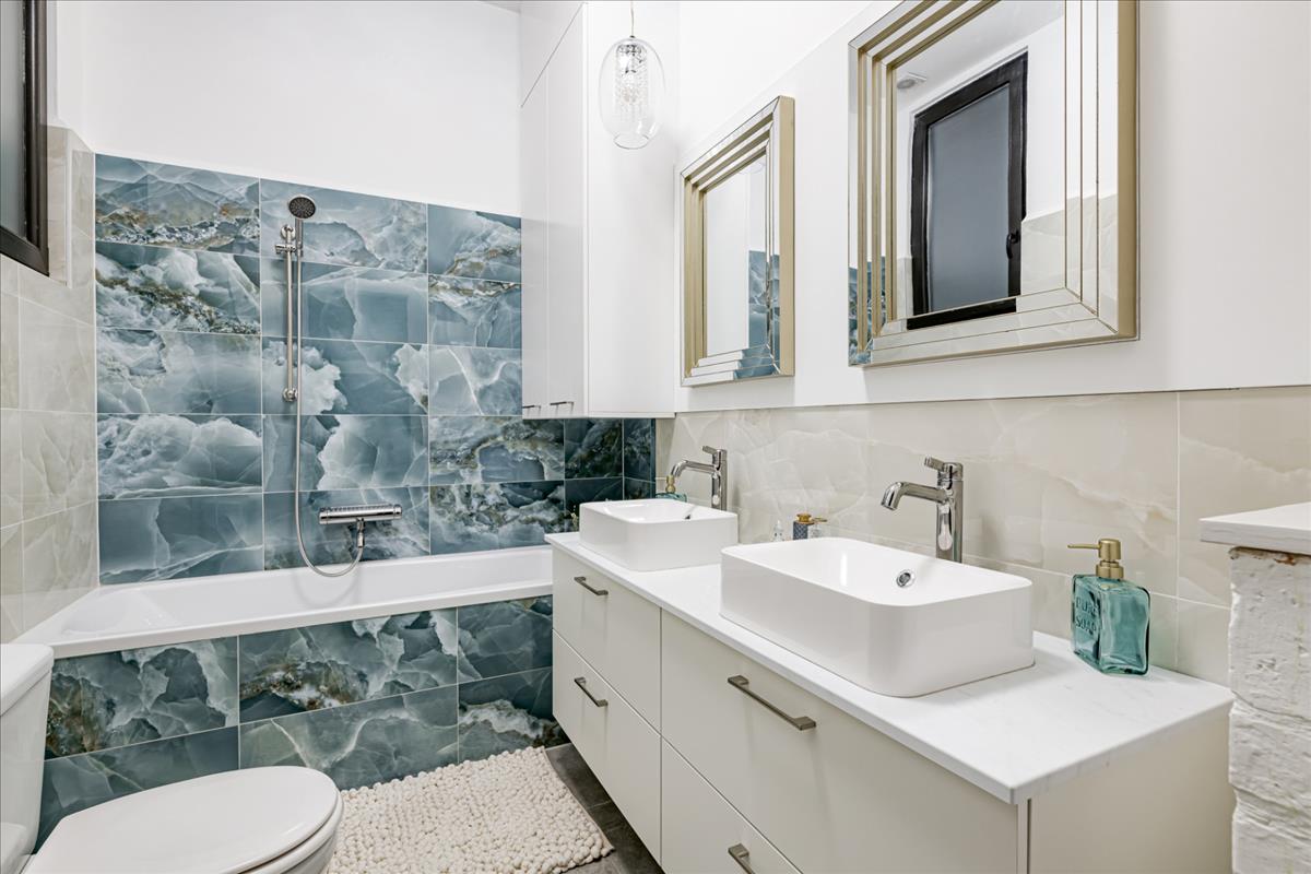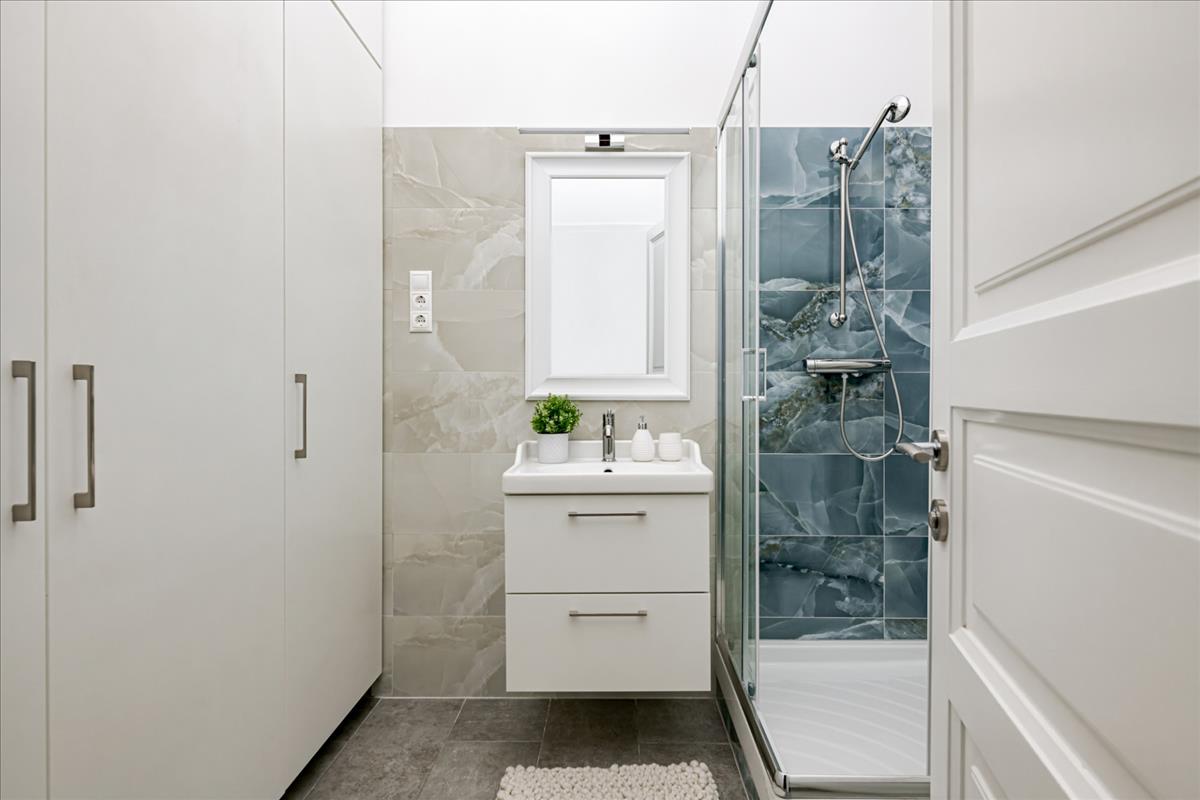 Az egyik megújult ablakos fürdőszoba zuhanyzós, wc-vel ellátott, rejtett háztartási helyiség funkcióval (a mennyezetig érő tárolóbútorban helyet kapott egy nagy méretű mosogató, a mosógép helye, és az összes háztartási eszköz tárolása is biztosított).