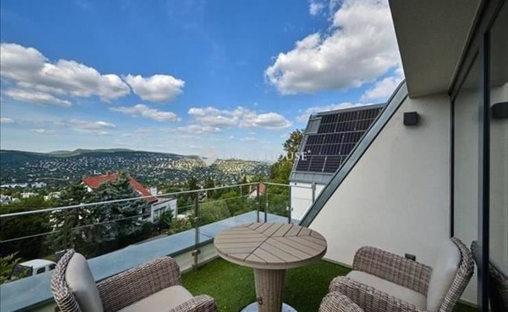 Emelet: a nappaliból induló elegáns lépcső vezet fel a hálószobákhoz. Itt található egy nagy hálószoba és két kisebb szoba, mindegyik külön illemhelyiséggel és beépített szekrényekkel. Az emeletről egy újabb terasz nyílik, ahonnan a Budai-hegyek látványa tárul elénk.