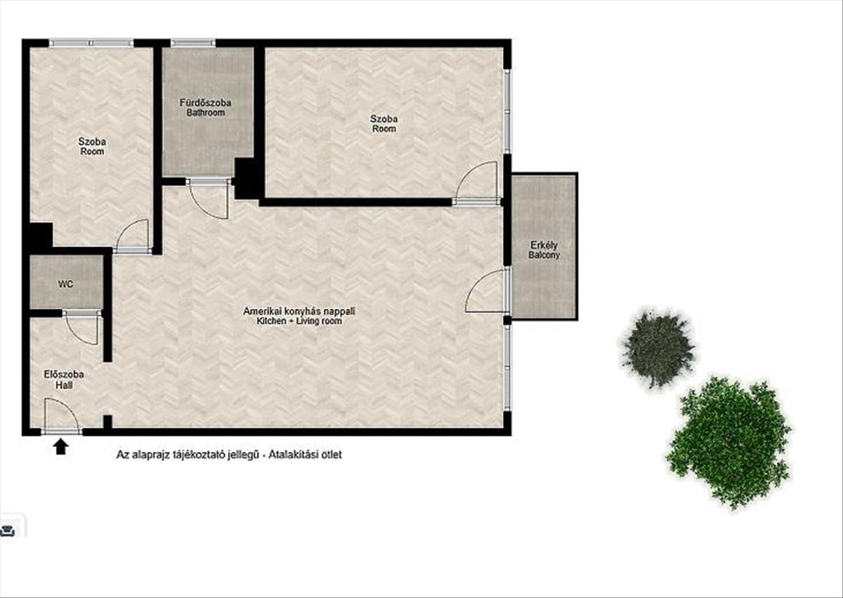 Igény szerint az ingatlan amerikai konyhás nappali + 2 hálószobássá alakítható.