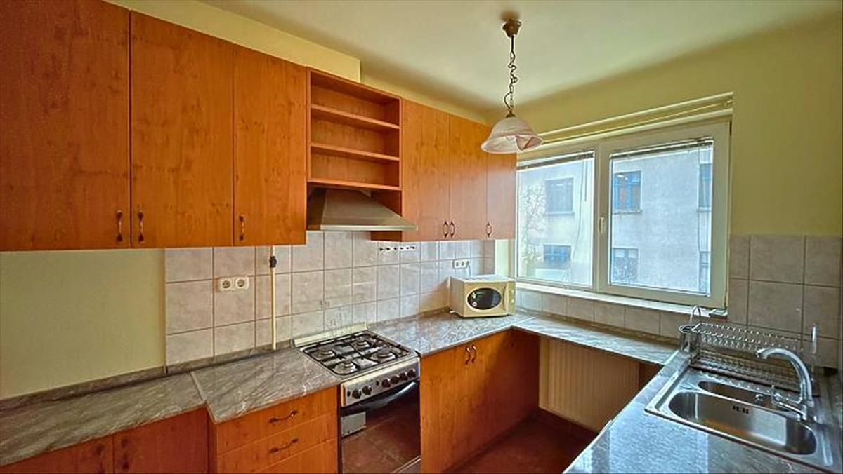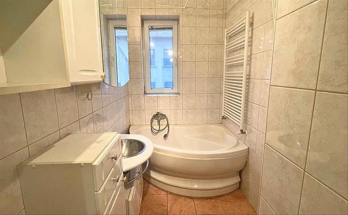 Konyhája világos, ideális méretű. Szomszédságában találjuk az ablakos, sarokkáddal szerelt fürdőszobát. a külön wc-t az előszobából közelíthetjük meg.