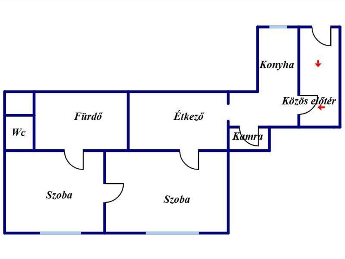 A lakás két szobás, körbejárható, étkezővel, konyhával, előtérrel és tárolóval.