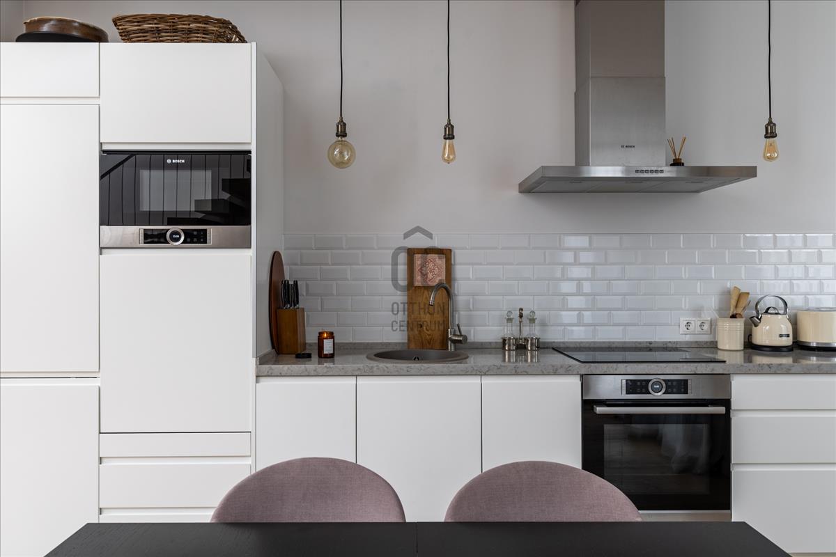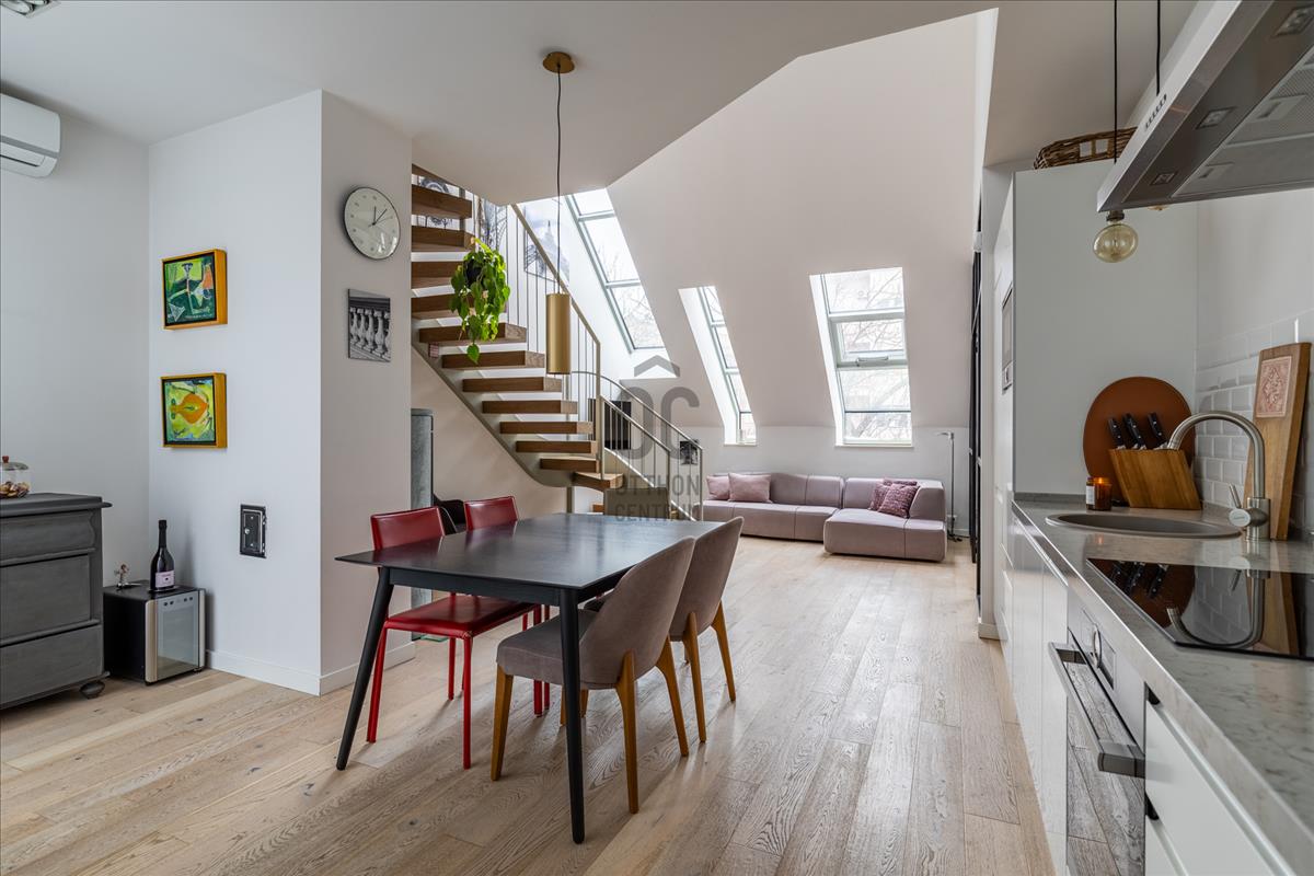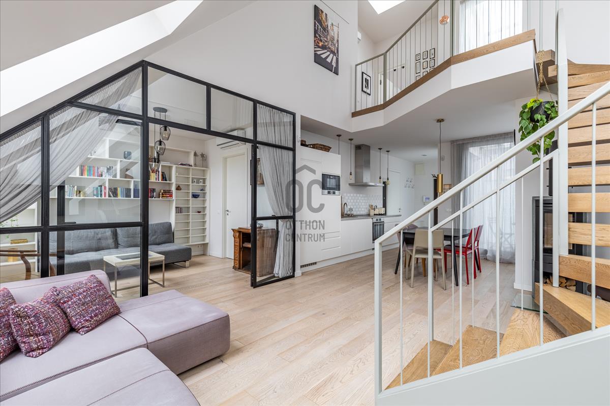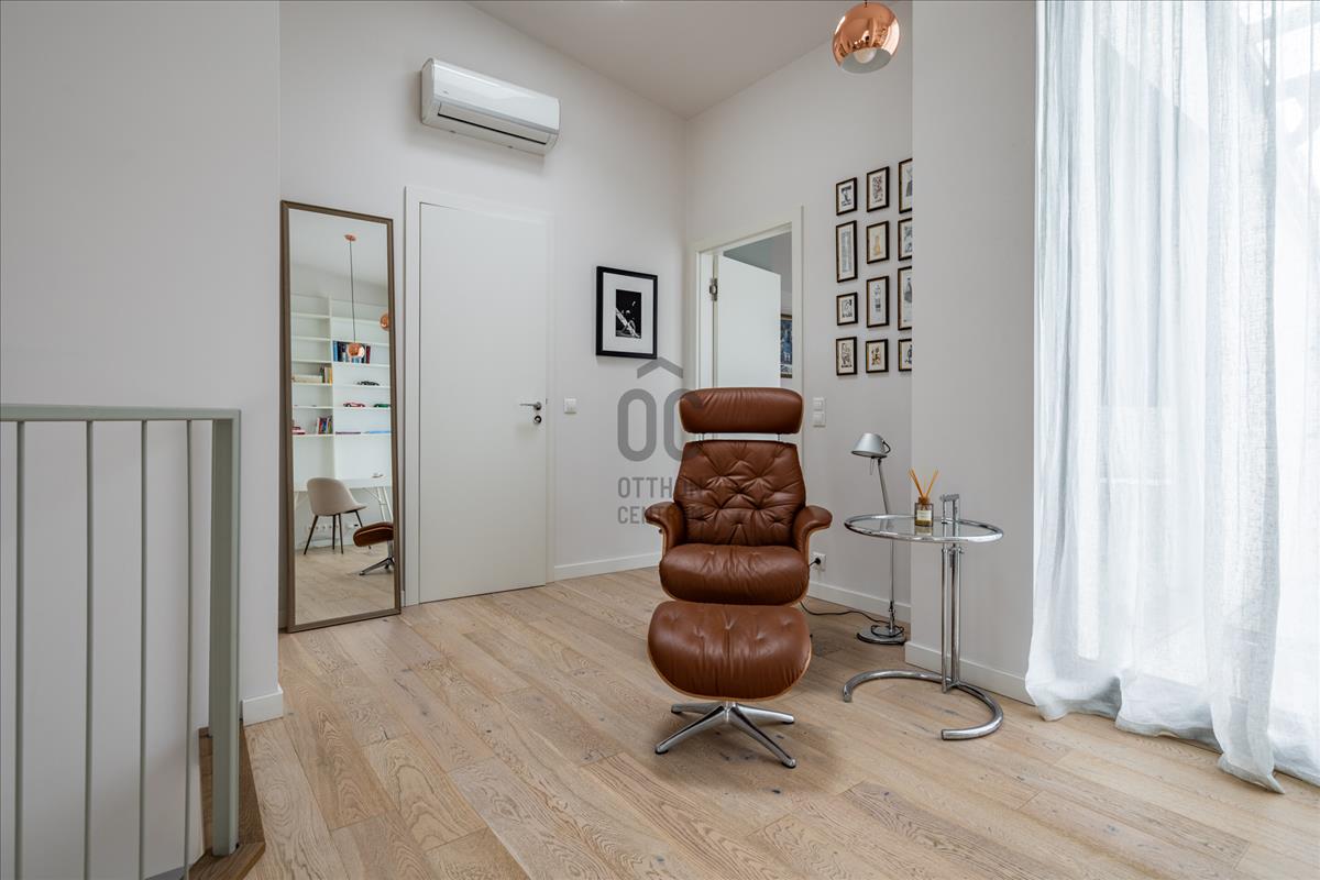 Kétszintes (duplex) kialakításával, tágas és szellős lakótereivel, valamint teraszával ez az otthon 2018-ban, ráépítéssel készült, tudatos tervezéssel, világos struktúrával és jól működő térarányokkal. a nagy belmagasság és a nagyméretű nyílászárók természetes fényt engednek be egész nap, ami érzetben lendületet és átláthatóságot ad a lakás minden pontján – különösen az alsó szint nyitott nappali–étkező–konyha terében.