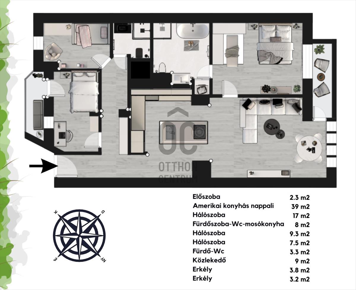 - Jelenlegi felosztása: előszoba, közlekedő, amerikai konyhás nappali, három külön nyíló szoba, két fürdőszoba- Wc, mosókonyha, két erkély.