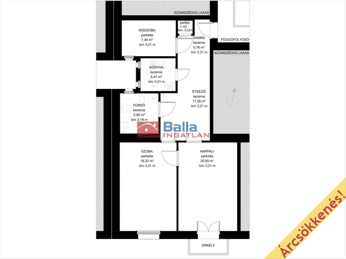 A lakásba belépve, egy kis előtéren keresztül jutunk a központi hallba. Itt alakították ki az étkezőt, és innen közelíthetők meg a további helyiségek, 3 külön nyíló szoba, konyha, éléskamra, kádas és zuhanyzós fürdőszoba Wc-vel, valamint a nappaliból a Hertelendy utcára nyíló erkély nyújt kellemes pihenést az itt élők számára. a 75 nm-es lakótér 17 nm-es előtér-hall-étkezővel, 7, 5 nm-es, 19, 5 nm-es, 20 nm-es szobával, 4, 5 nm-es ablakos konyhával, 0, 75 nm-es kamrával, 6 nm-es ablakos fürdővel, valamint 3 nm-es erkéllyel rendelkezik.