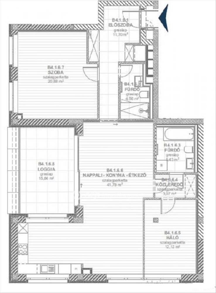 A lakás helyiségei: Előszoba, Fürdőszoba, Fürdőszoba, Szoba, Szoba, Amerikai konyhás nappali, Közlekedő.