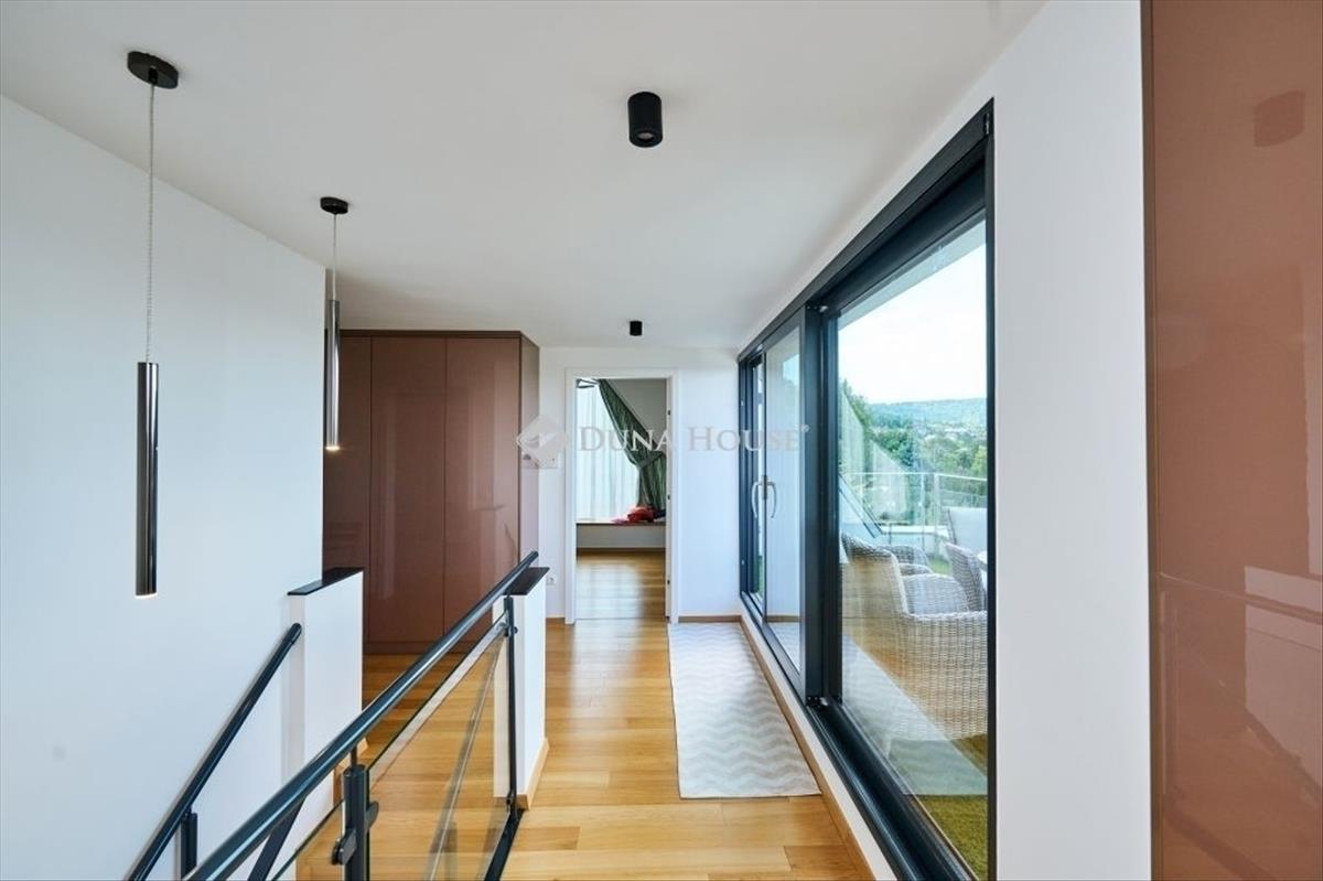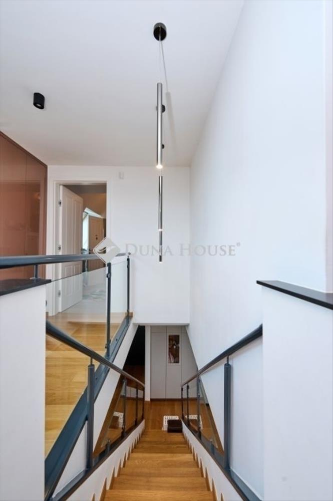 Emelet: a nappaliból induló elegáns lépcső vezet fel a hálószobákhoz. Itt található egy nagy hálószoba és két kisebb szoba, mindegyik külön illemhelyiséggel és beépített szekrényekkel. Az emeletről egy újabb terasz nyílik, ahonnan a Budai-hegyek látványa tárul elénk.