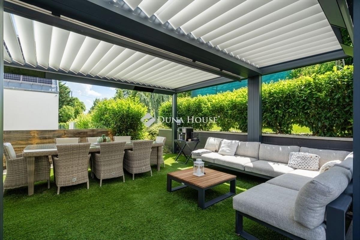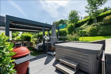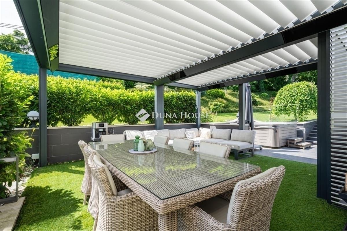 Földszint: Belépve tágas előtér fogadja, amelyből közvetlenül a miele gépekkel felszerelt, modern konyhába érkezünk. a nappali és étkező elegáns, egyedi design bútorokkal berendezett, igazi családi élettér. Innen nyílik a lakás egyik legkülönlegesebb része: a 39 m²-es, fűthető terasz, amely nyitható-zárható pergolával, jacuzzival teszi teljessé a mindennapokat. a teraszhoz kapcsolódik a 568 m²-es kizárólagos használatú kert, automata öntözőrendszerrel és saját kertésszel.