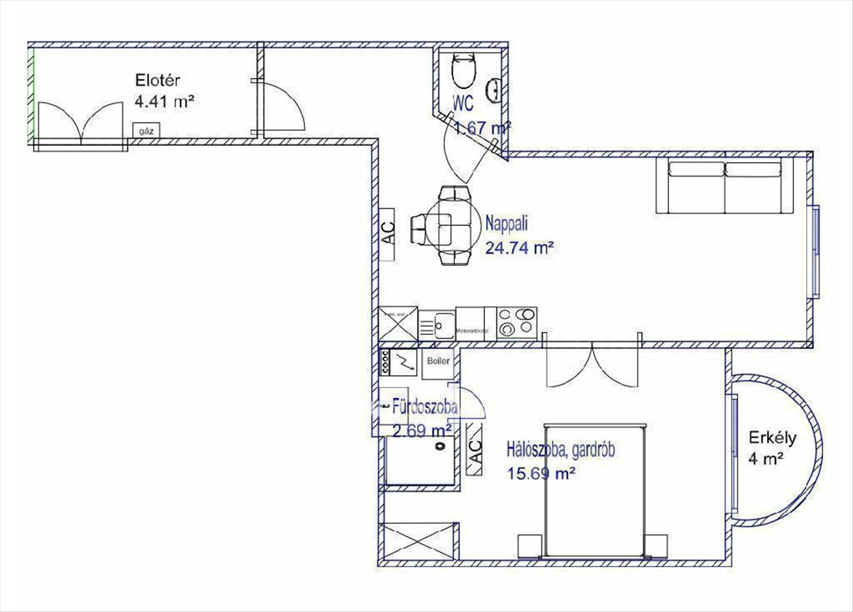 Egy nappalival, egy hálószobával, fürdőszobával, gardrób szovábal és külön wc-vel került kialakításra.