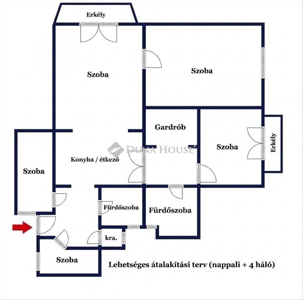 A jelenlegi elrendezés nappali + 3 hálós, 2 fürdőszobával, de könnyedén nappali + 4 hálóssá alakítható. a tágas nappali erkéllyel, külön étkezővel és jól szeparált hálókkal ideális családok számára.