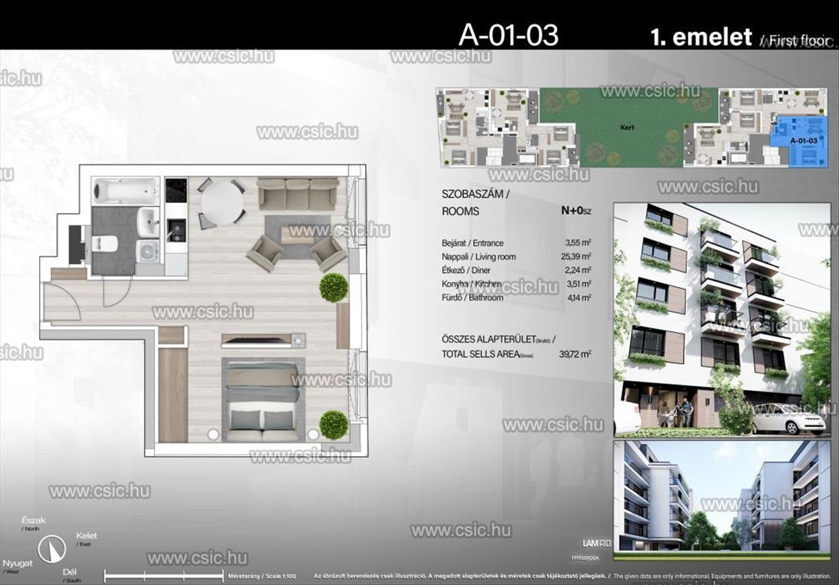 A lakás a társasház első emeltén található, 39, 72 nm , 1 szobás.
