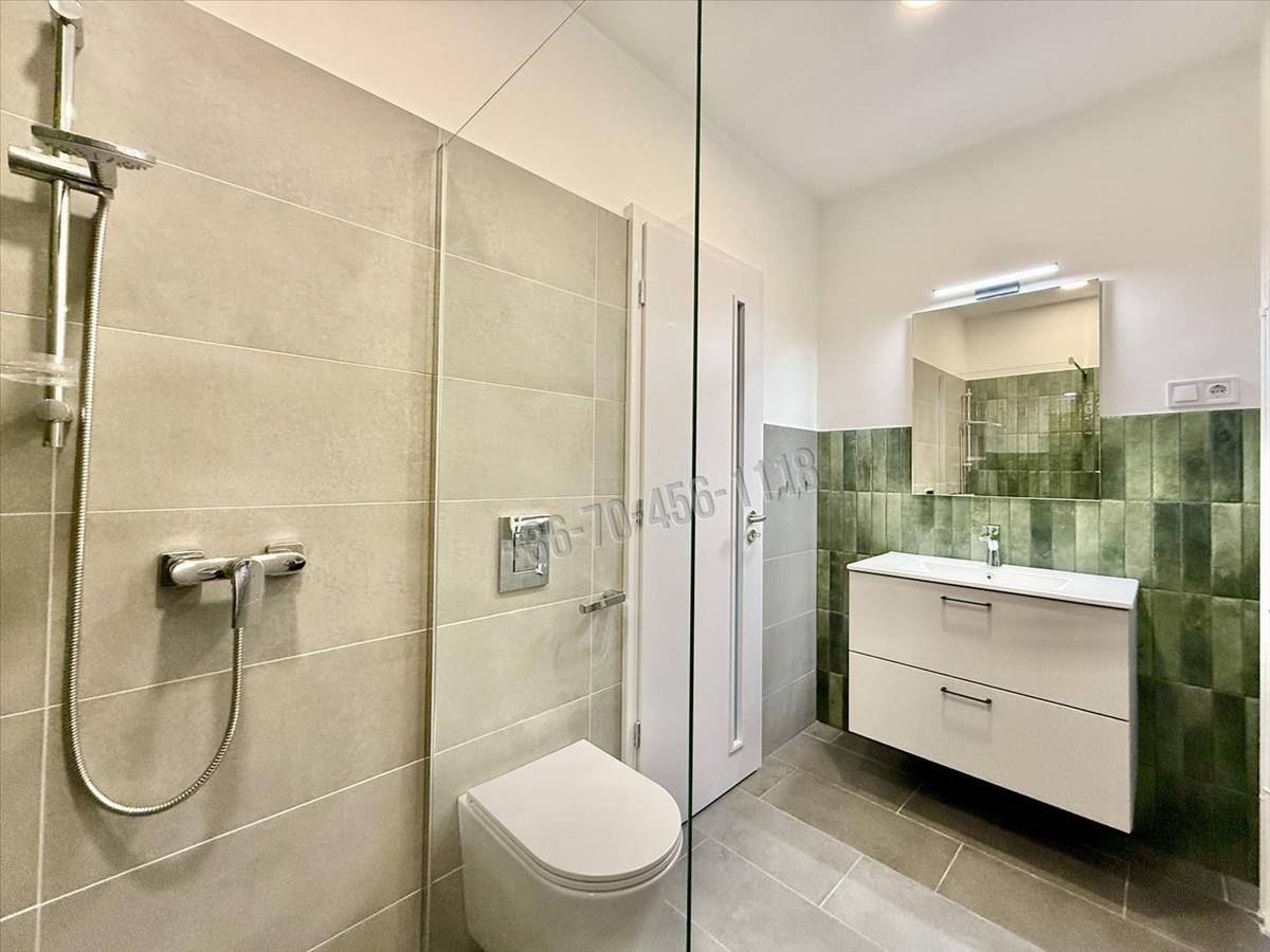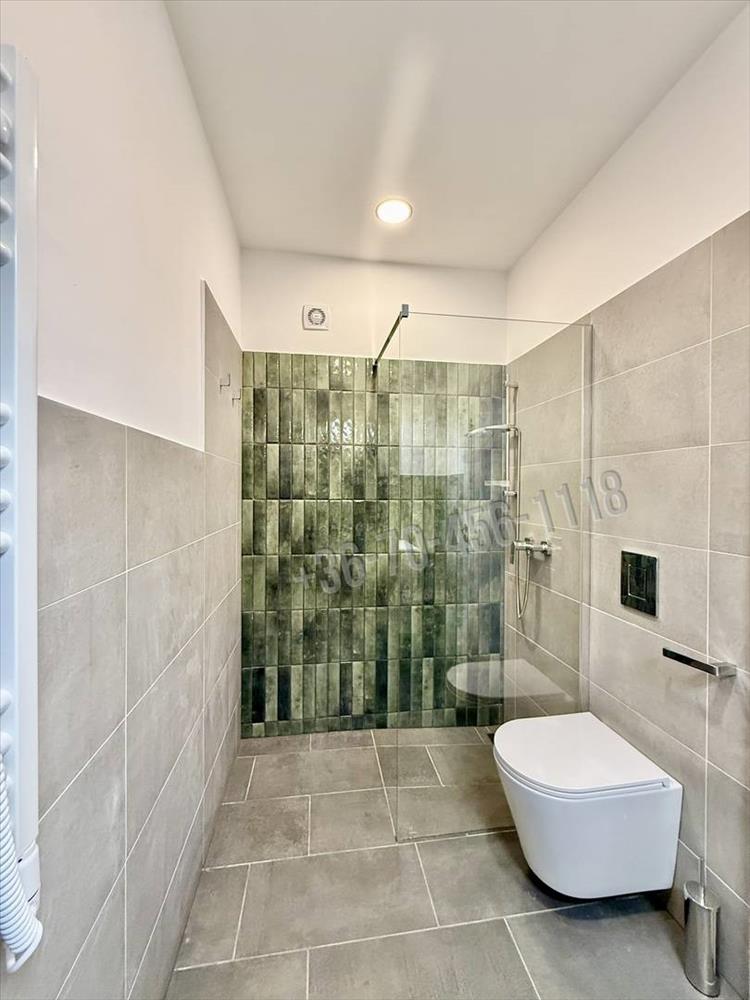 A fürdőszoba modern, elegáns kialakítású: sík üvegfallal határolt, épített zuhanyzó készült sötétzöld mázas kerámiával burkolt hátfallal, fiókos mosdószekrénnyel és törölközőszárítós radiátorral. a mosó- és szárítógép külön háztartási / gardrób helyiségben kapott helyet – amely igény szerint külön mosdó helyiséggé vissza alakítható -, növelve a lakás praktikus használhatóságát.