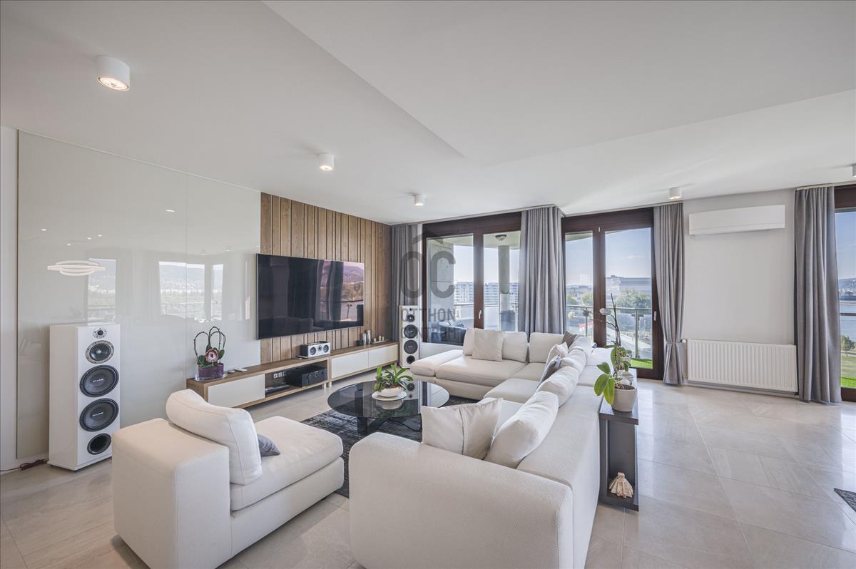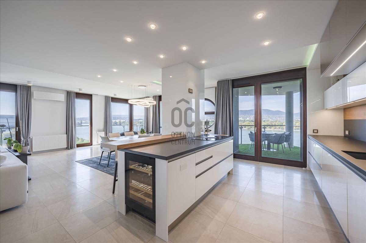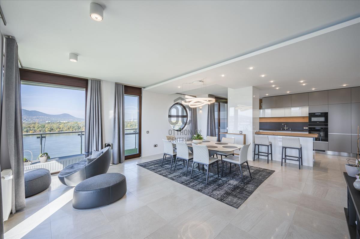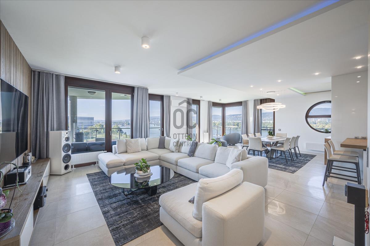 XIII. Marina parton eladó egy teljeskörűen felújított, négyszobás (nappali + 3 hálószoba), hatodik emeleti, 209nm alapterületű + 77nm erkéllyel rendelkező, dunai panorámás, délnyugati tájolású luxus mőségű lakás. Az ingatlan közvetlenül a Duna-parti sétány legelején helyezkedik el, így nemcsak a Duna, hanem Budapest belvárosának jellegzetes látképét is élvezhetik tulajdonosai.Az apartman átépítése belsőépítész által, egyedi megoldásokkal, prémium minőségű bútorok és eszközök beépítésével történt.