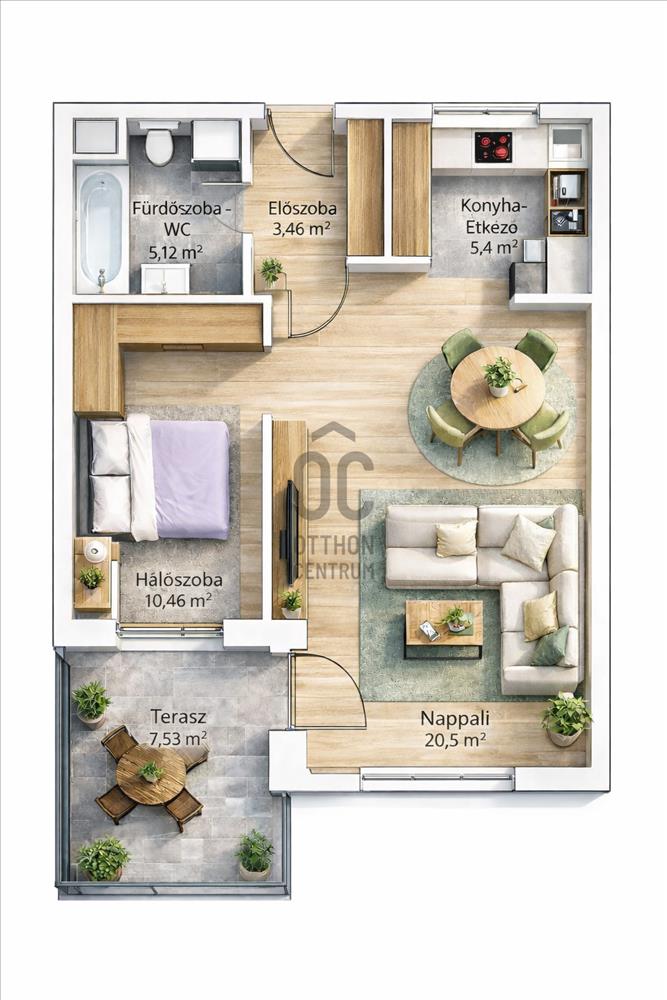 • 46 m² lakás + 7, 5 m² részben fedett terasz