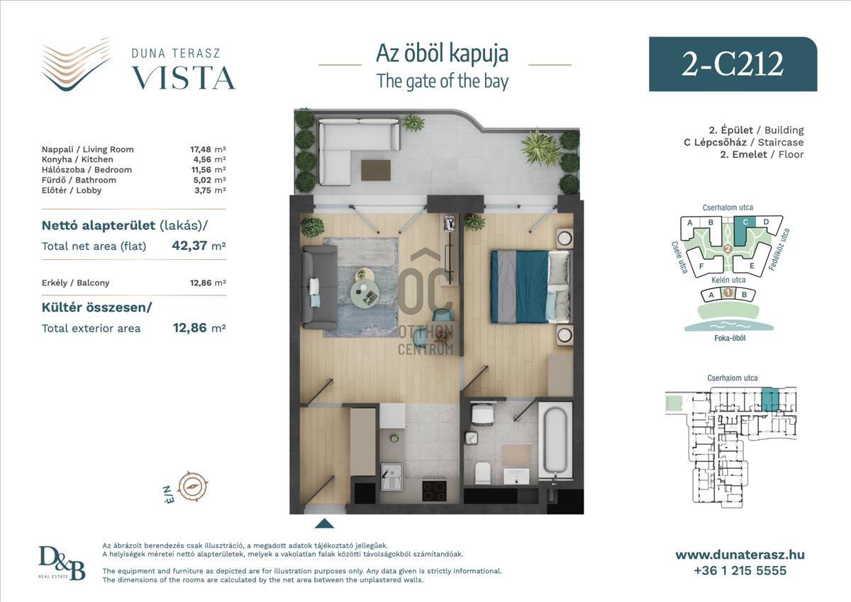 A 2026 őszén átadásra kerülő Duna Terasz Vista-ban eladó egy 2. emeleti, utcai nézetű kétszobás új építésű lakás.