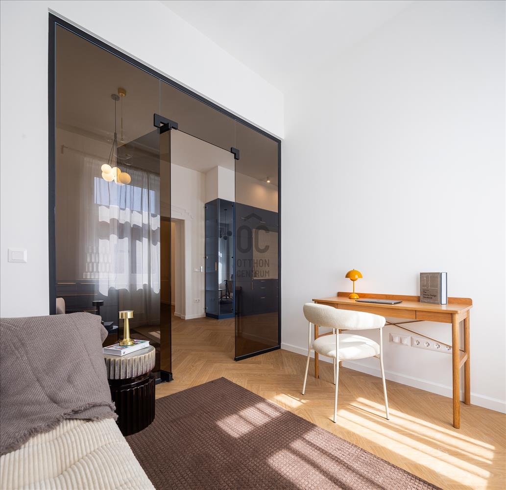 Amerikai konyhás nappali, hálószoba, valamint egy üvegfallal leválasztott dolgozószoba, ami akár hálószobaként is funkcionálhat