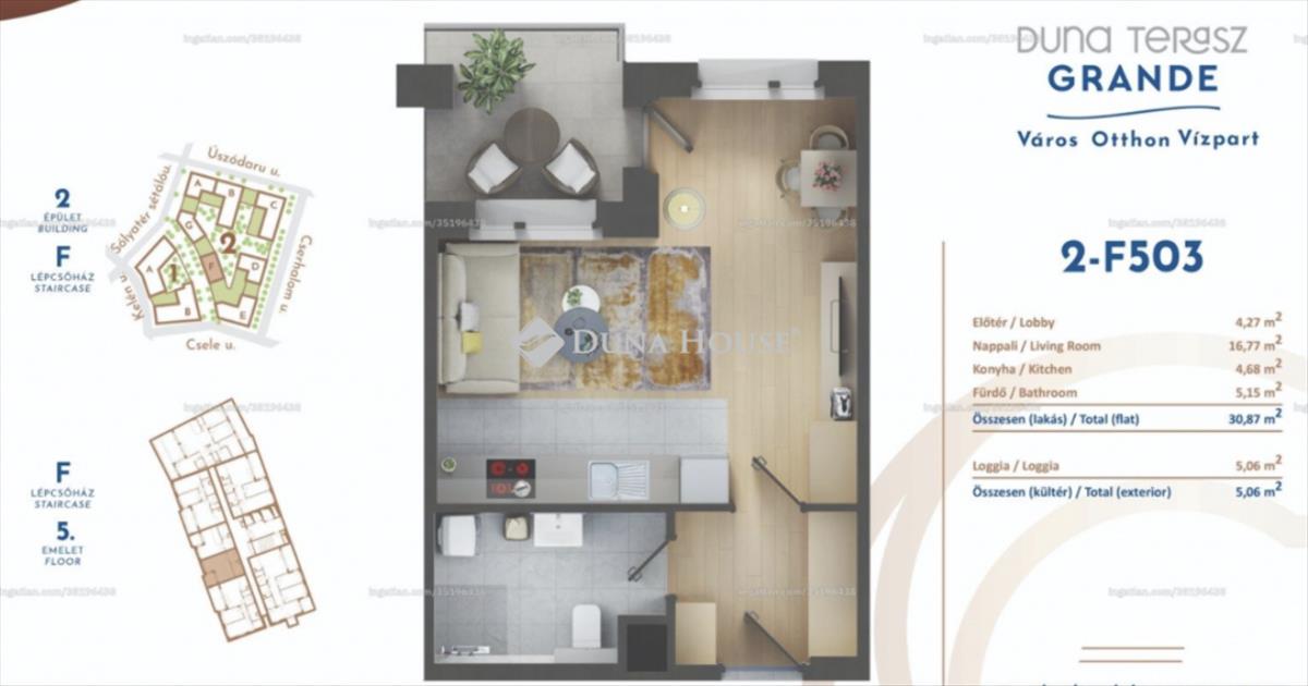 Eladó a Duna Terasz Grande társasházban, egy 5. emeleti, DNY-i tájolású, napfényes, 31 nm -es ingatlan + 5 m2 erkéllyel, azonnal költözhető. Az ingatlan még nem lakták, így Ön lehet az első lakója. Kilátással a csendes sétányra és egy kicsit a Dunára is! a lakás teljes berendezéssel eladó. a társasház rendezett és tiszta, lakói számára biztonságos környezetet biztosít. Pár lépésre a Duna part, de számtalan szórakozási és sportolási lehetőséget talál ebben az exkluzív környezetben: Marina sétányon játszóterek, kültéri edzőterem, teniszpálya igényes éttermek, kávézók, élelmiszerbolt, jacht kikötők, kondi termek, medencék, futó pálya. Frekventáltságát tekintve 5 percre a 3-as metró, buszok, kerékpárút szinte a ház előtt, a kikötő kb. 100 Méter, így akár autóval, biciklivel, metróval vagy akár hajóval is elérheti a belvárost. a Duna-parti lakások igen kedveltek a befektetők körében, nem ok nélkül. a korlátozottan rendelkezésre álló, Duna menti telkeken épült ingatlanok azon felül, hogy értékállóak minden évben jelentősen növekszik az értékük, illetve gyorsan és egyszerűen bérbe lehet adni, így akár kiemelkedő hozamot biztosítanak tulajdonosaiknak. Ne habozzon, tekintse meg ezt a különleges lehetőséget, és szeressen bele!