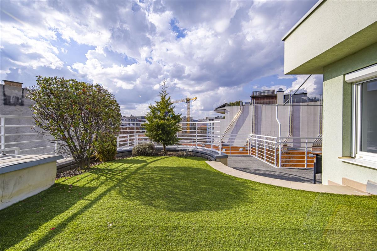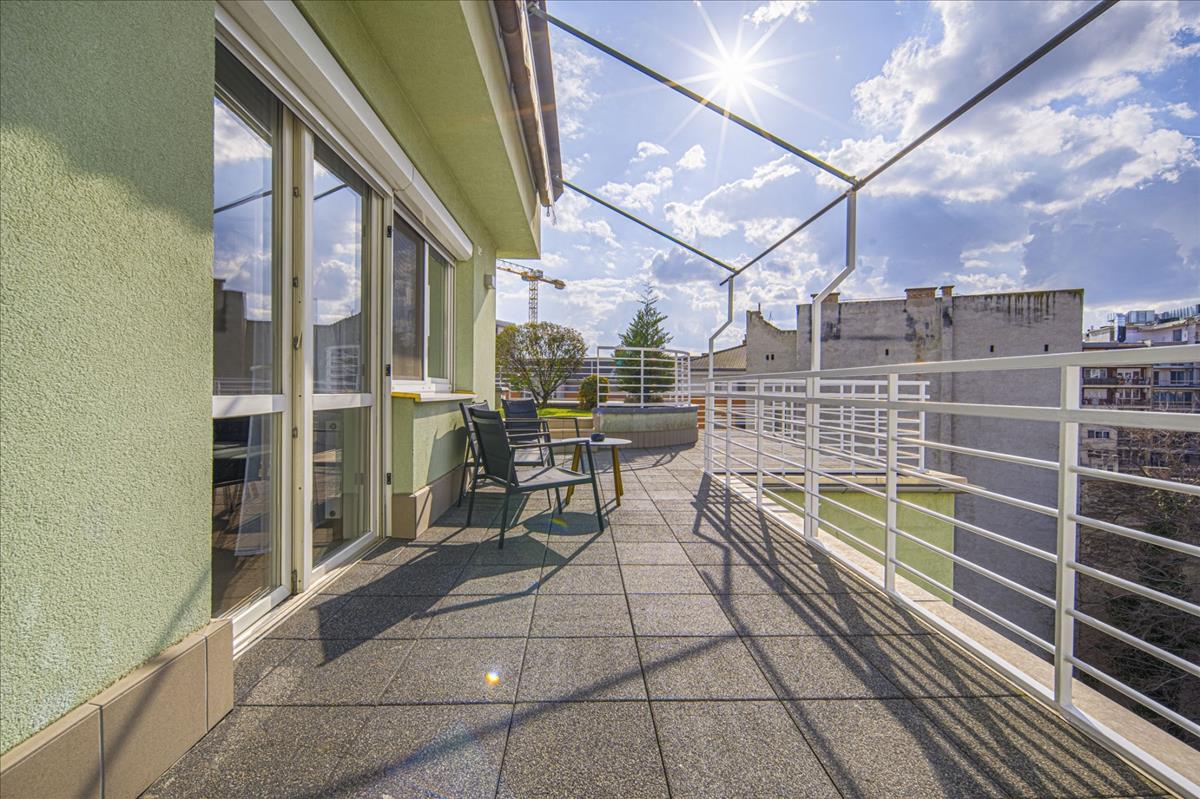 83 Négyzetméter tetőterasz a város felett, melyhez nyugati tájolású és belső udvar felől elhelyezkedő lakás társul. Így nem csak nagy, nyitott tér és kilátás, de a nyugodt, csendes környezet is biztosított.