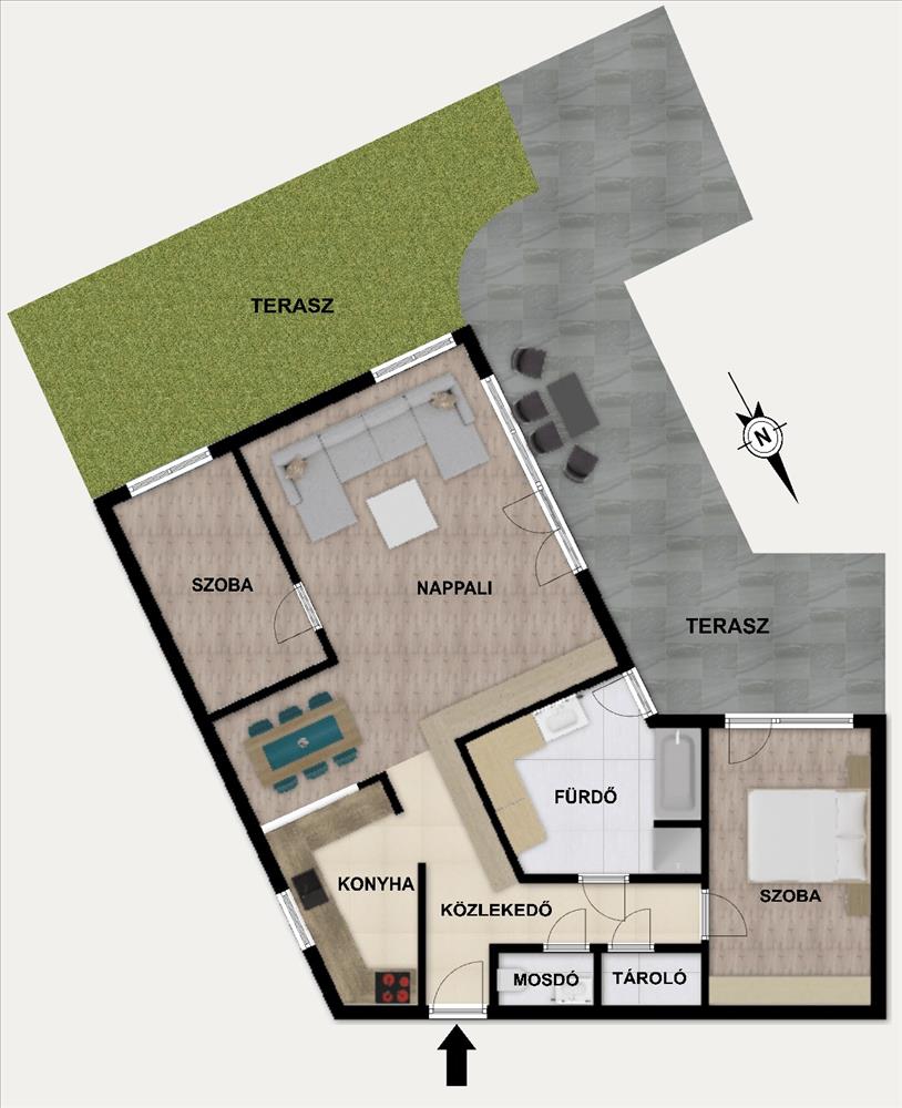 Nappali + 2 háló, külön mosdó, átadópultos, ablakos, étkezős konyha, külön tároló, rengeteg beépített szekrény és határtaran lehetőségek a két szintes teraszon, ami mind igazán értékállóvá, jól kiadhatóvá és likviddé teszik az ingatlant.