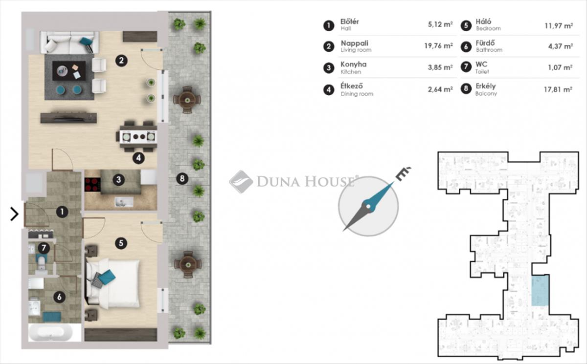 Azonnal költözhető újszerű magasemeleti lakás nagy terasszal, gépesített konyhával, klímával az árban.